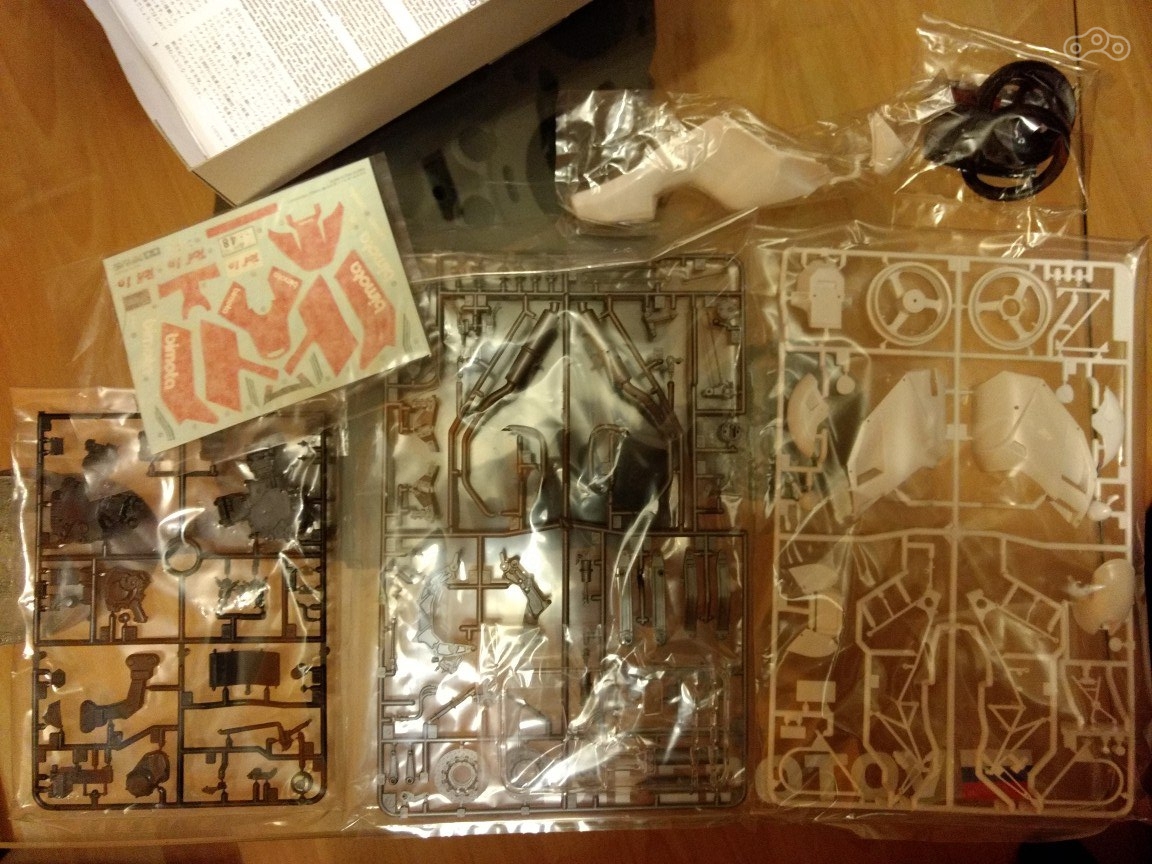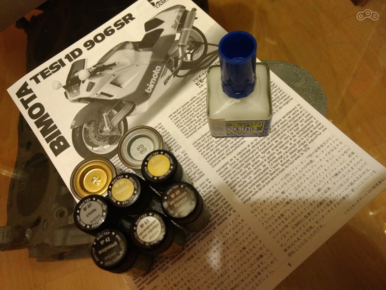 Ценник не кусался, около 2300 рублей за коробку со всеми деталями, однако, сразу было ясно, что этой суммой дело не ограничится. Конечно, можно собрать как есть, используя один лишь клей - в комплекте уже есть резина, чехол для обтяжки седла, все необходимые болты и даже отвертка, однако, выглядеть такая модель будет не очень круто. Для полноценной сборки придется потратить еще как минимум полторы-две тысячи рублей на краску, кисти, полупрозрачный лак для поворотников и фонарей, а так же специальную жидкость для "приварки" декалей, без нее красиво и ровно наклеить их невозможно.
