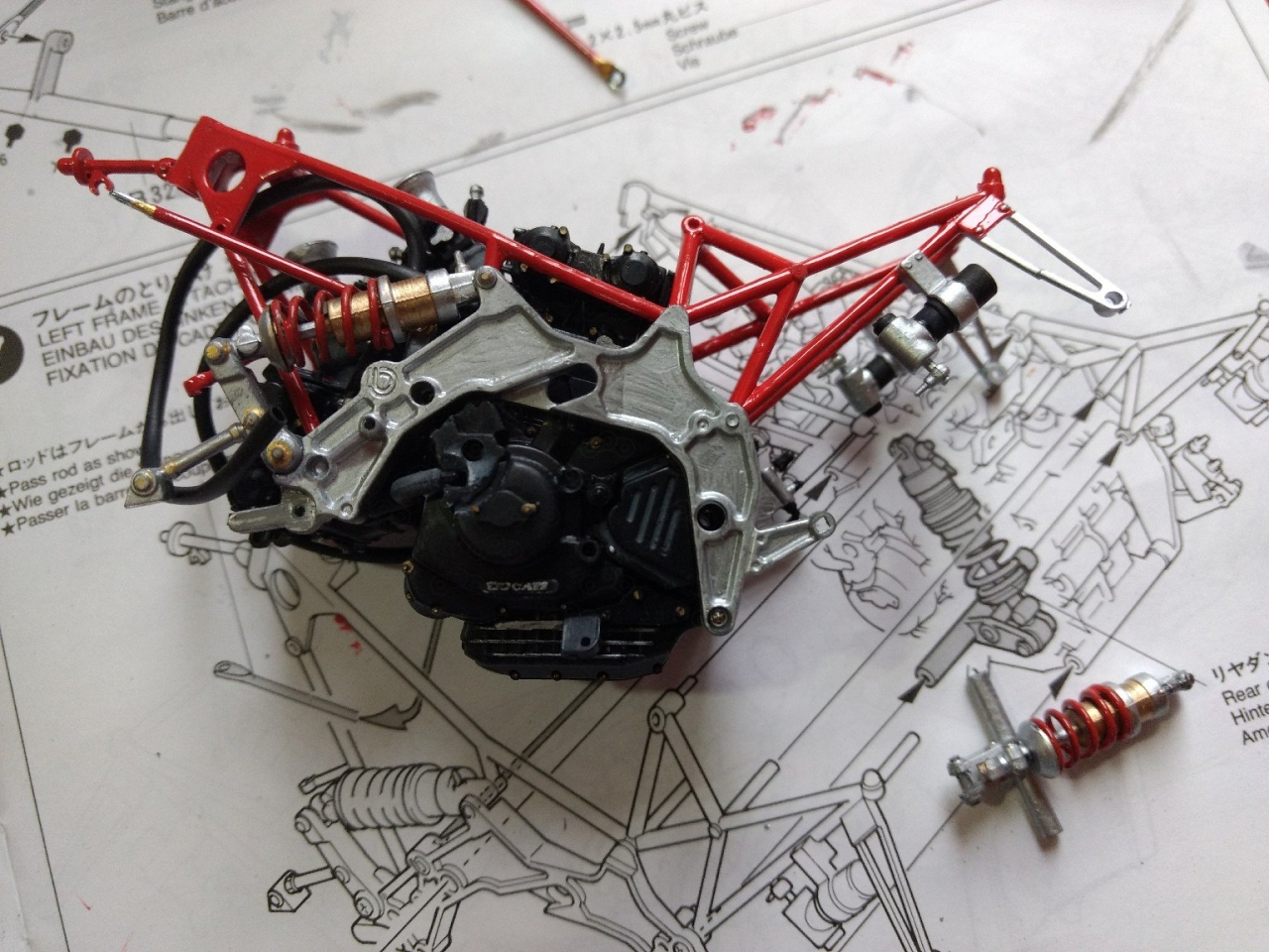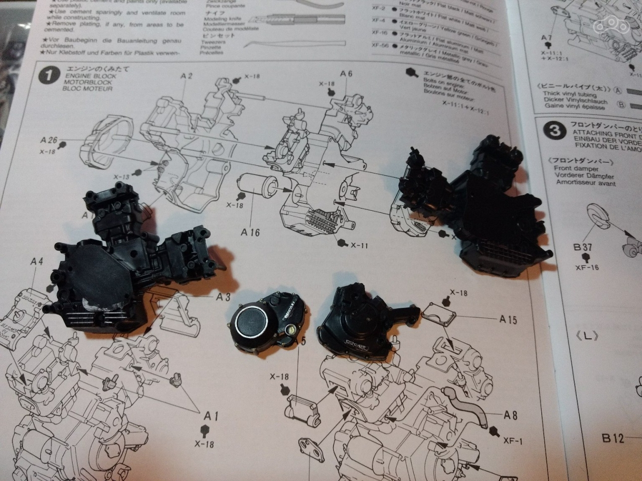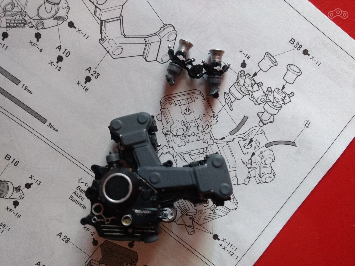 Начинается все со сборки мотора, и уже здесь появляются первые трудности. Например, очень сложно нанести краску на ребра мотора, которые есть у оригинального мотоцикла. Но если краску, в случае неудачи, можно смыть и нанести заново, то подтеки клея убрать будет сложнее, если вообще возможно, поэтому его лучше всего наносить иголкой. Детали мелкие, среди них - масляный фильтр, стартер, дроссельные заслонки, состоящие из нескольких элементов, а так же куча крышек, расположенных на цилиндрах, с ними тоже придется помчаться.