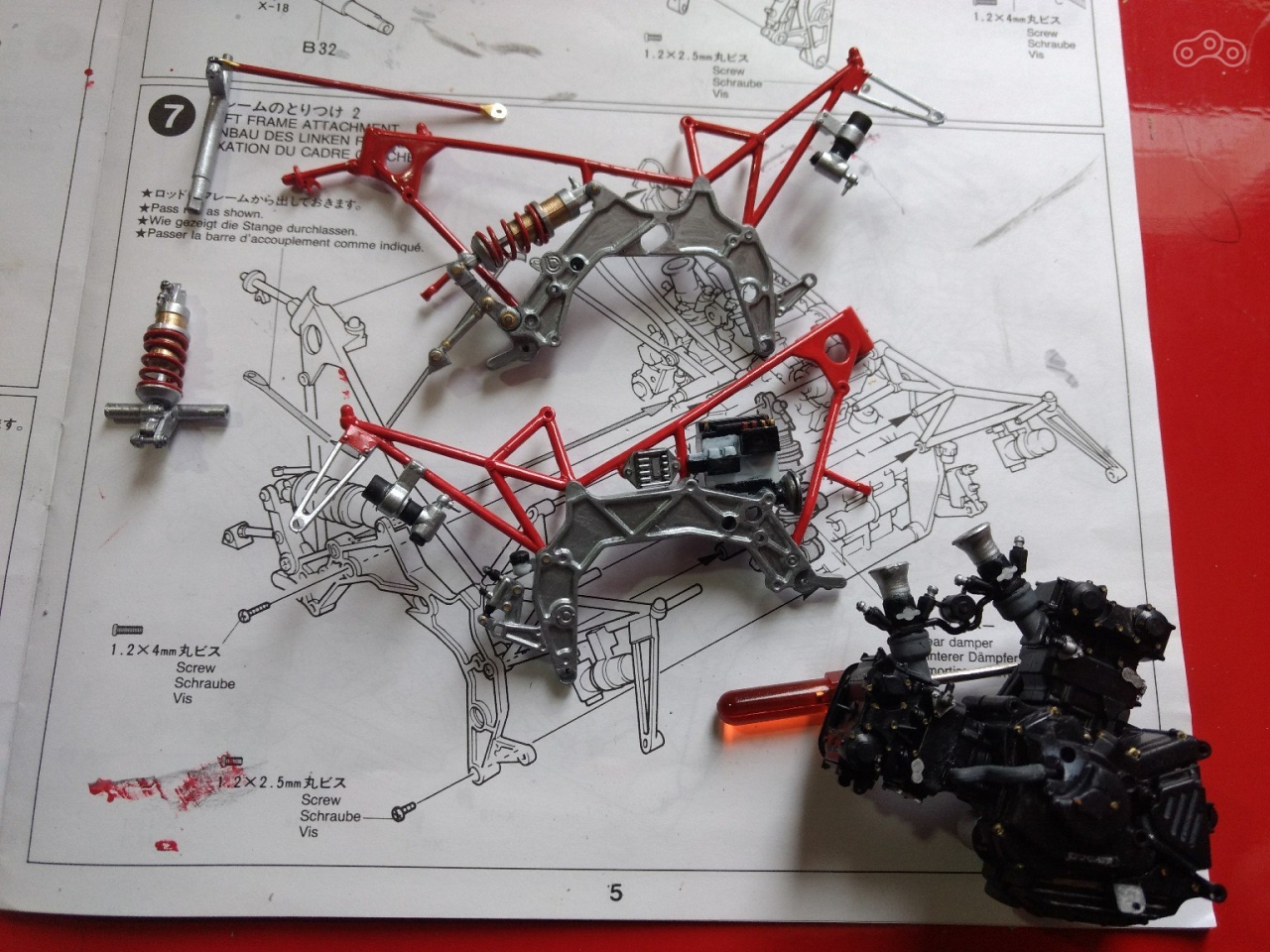 Следом за ним идет сборка рамы, как и у настоящего мотоцикла, состоящая из двух элементов огибающих мотор и трубчатой конструкции. Их перед сборкой необходимо покрасить и как следует высушить.