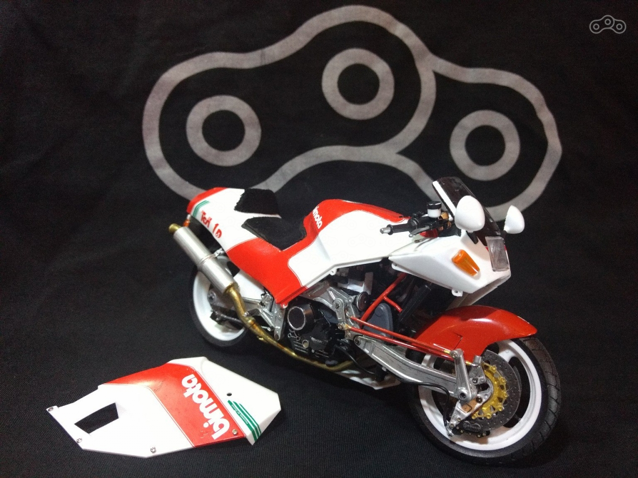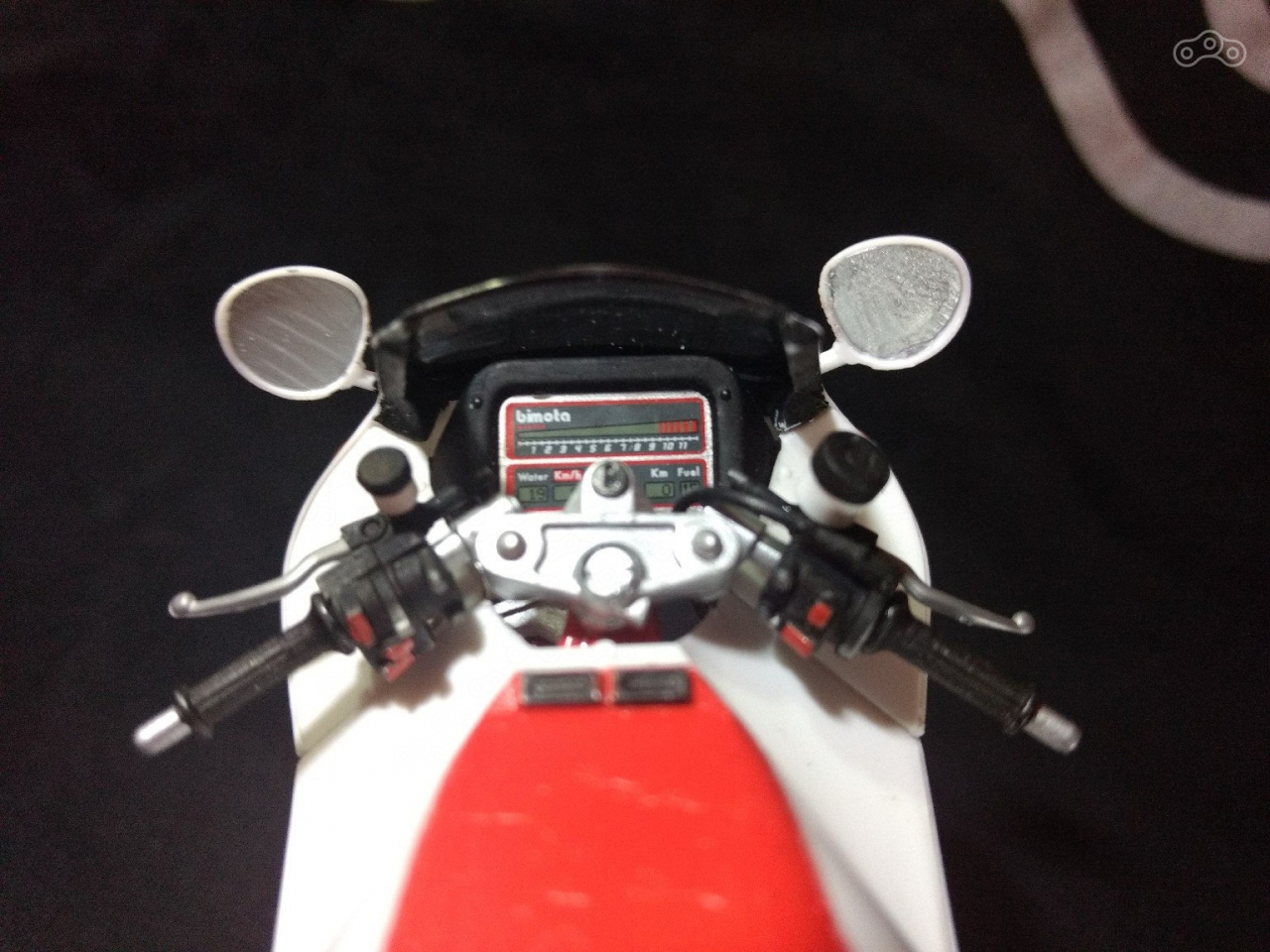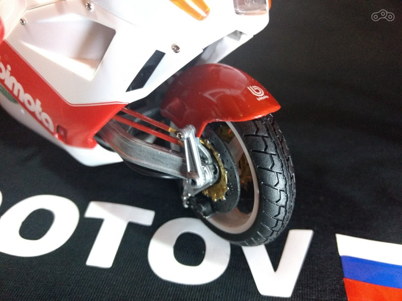 С оперением так же ничего сложного. Обтекатели состоят из тех же элементов, что и у настоящего мотоцикла и так же крепятся болтами, под которые в комплект входит специальная отвертка. Пластик, как и у оригинального мотоцикла, белый, поэтому красить нужно разве что переднее крыло, а вот нанесение декалей потребовало определенной сноровки и специальной жидкости. Именно благодаря ей графика сваривается с пластиком и начинает равномерно облегать обтекатели. Нет сложностей и с чехлом сиденья, благо материал входит в комплект а выкройка прямо в инструкции. В итоге получается вот такая красота: