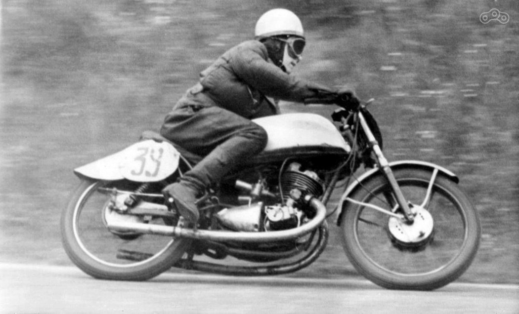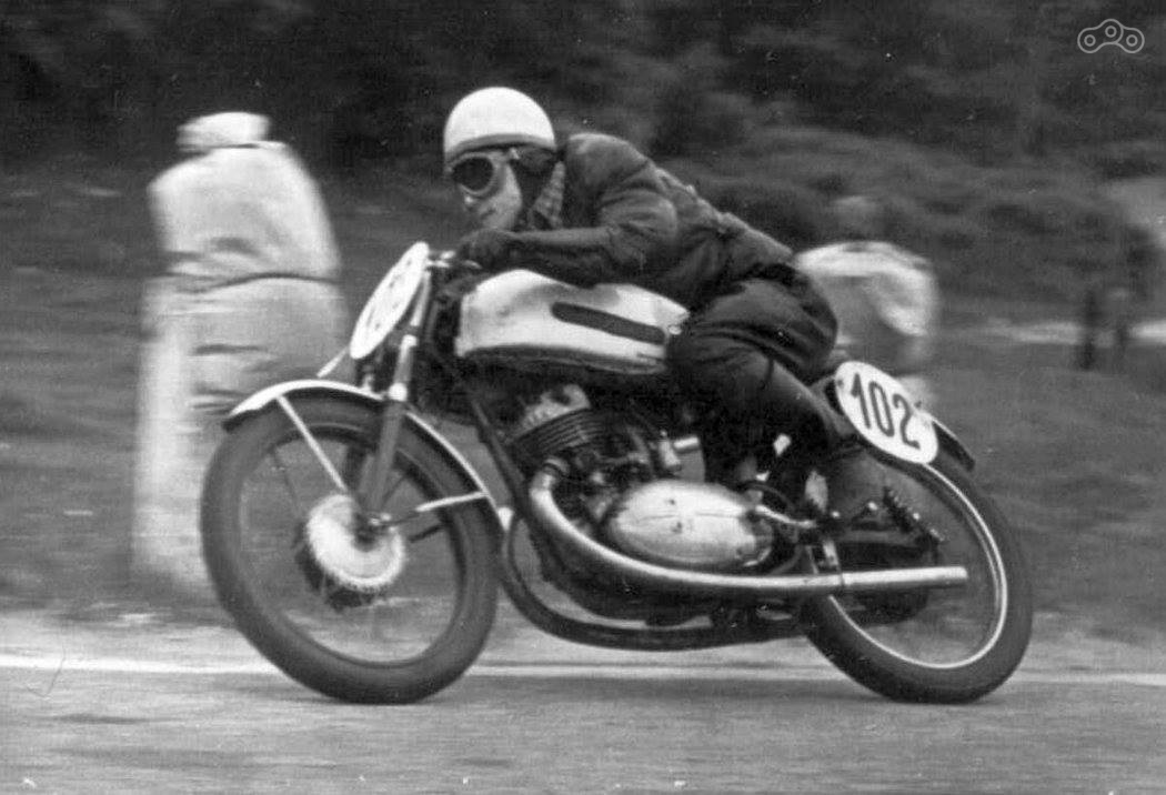 Иж - 350 на трассе, 1953 год, гонщик Helju Küünemäe. Как вам такой способ облегчения передней подвески?