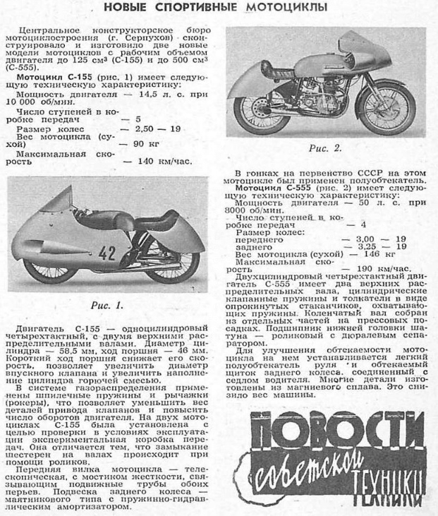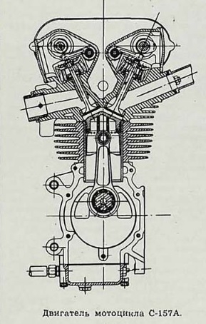 Двигатель С - 157 с размерностью 58,5 на 46 мм. имел объем 174 куб.см и развивал мощность 14,5 л.с. при 10000 об/мин. Этого хватало, чтобы разогнать мотоцикл до 140 км/ч.