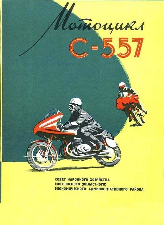 Не удалось найти никакой информации о мотоцикле С - 557, придется ограничиться обложкой рекламного буклета. Из индекса понятно, что объем двигателя был до 500 кубов. скорее всего это был модернизированный С - 555.