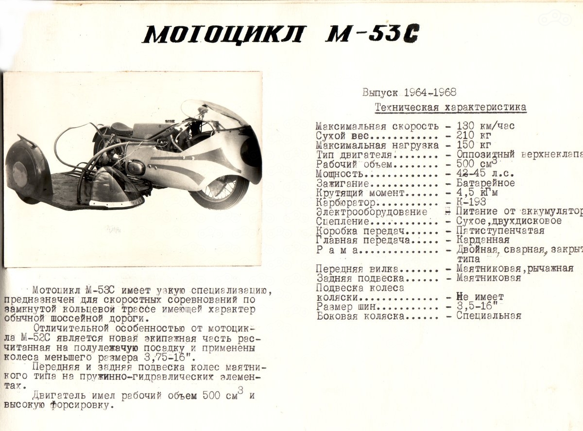 Выпускался М - 53С до 1968 года, потом его сменил М - 63С "Стрела - 1", оппозитные мотоциклы с коляской полностью перешли в класс "до 650 куб.см.". В более мелкой кубатуре в лидеры вышли мотоциклы с двухтактными двигателями.