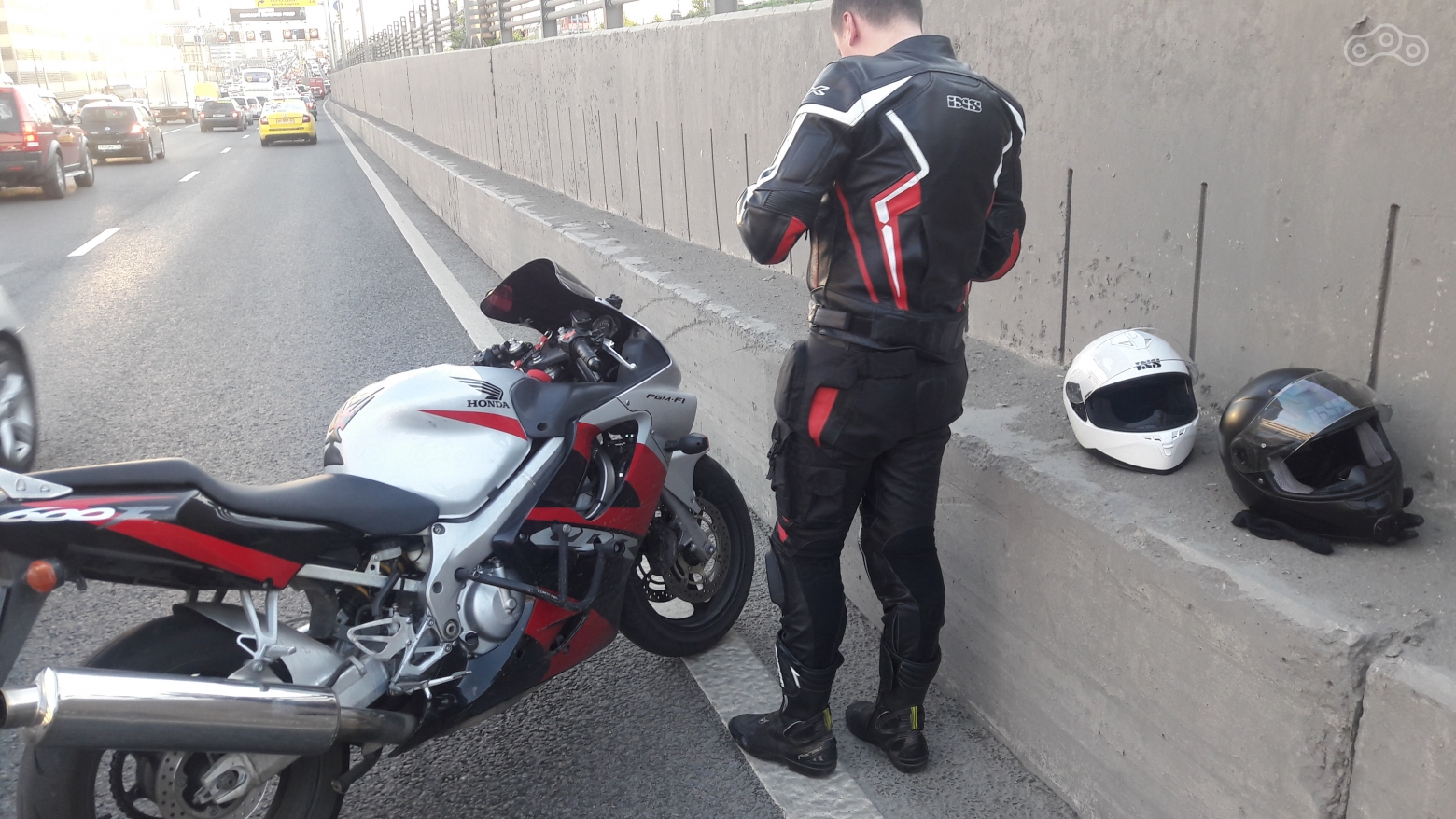 Вот так в обычный день таксист всем известного поискового сервиса, сидя в телефоне в левом ряду, внезапно, решил перестроится и вытолкнул меня из междурядья. А дальше, как в замедленном кино. Понимаю, проскочить некуда, впереди колом встала машина. Экстренное торможение, и вот победа, думал я. В самый последний момент, мотоцикл ушел из под меня, я в месте с оторванным зеркалом оказался на теплом асфальте. Не понимая, что происходит вокруг, подбежала жена, расспрашивает, как мне загорается между полос. А я понять не могу, осматриваю жену (она же без экипа), но ей в последний момент удалось соскочить с мотоцикла и даже не притронулась к асфальту. Таксист дал "по газам" и смысла чуть ли не соприкасаясь с отбойником. Люди из машин повыскакивали, все хотели помочь. Отдельное спасибо и уважение. В тоже время, грустно рассматривал масляное пятно с красным антифризом под моим двухколесным другом.... СТОП! Но у меня же синий!?