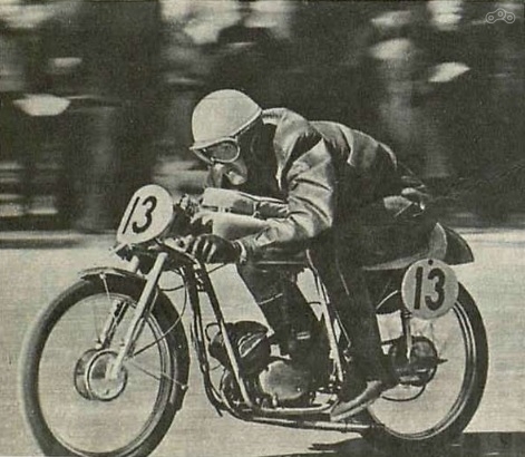 Рижский завод "Саркана звайзгне" представил свой первый гоночный мотоцикл SZ - 50. На снимке заводской гонщик А. Ахранович.
