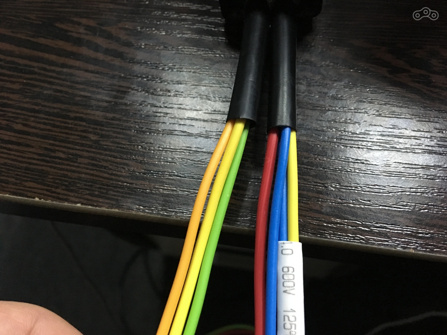 В кастомном реле у нас две пары синих и жёлтых проводов. При этом одна из пар — в кембрике (кусочке термоусадки):