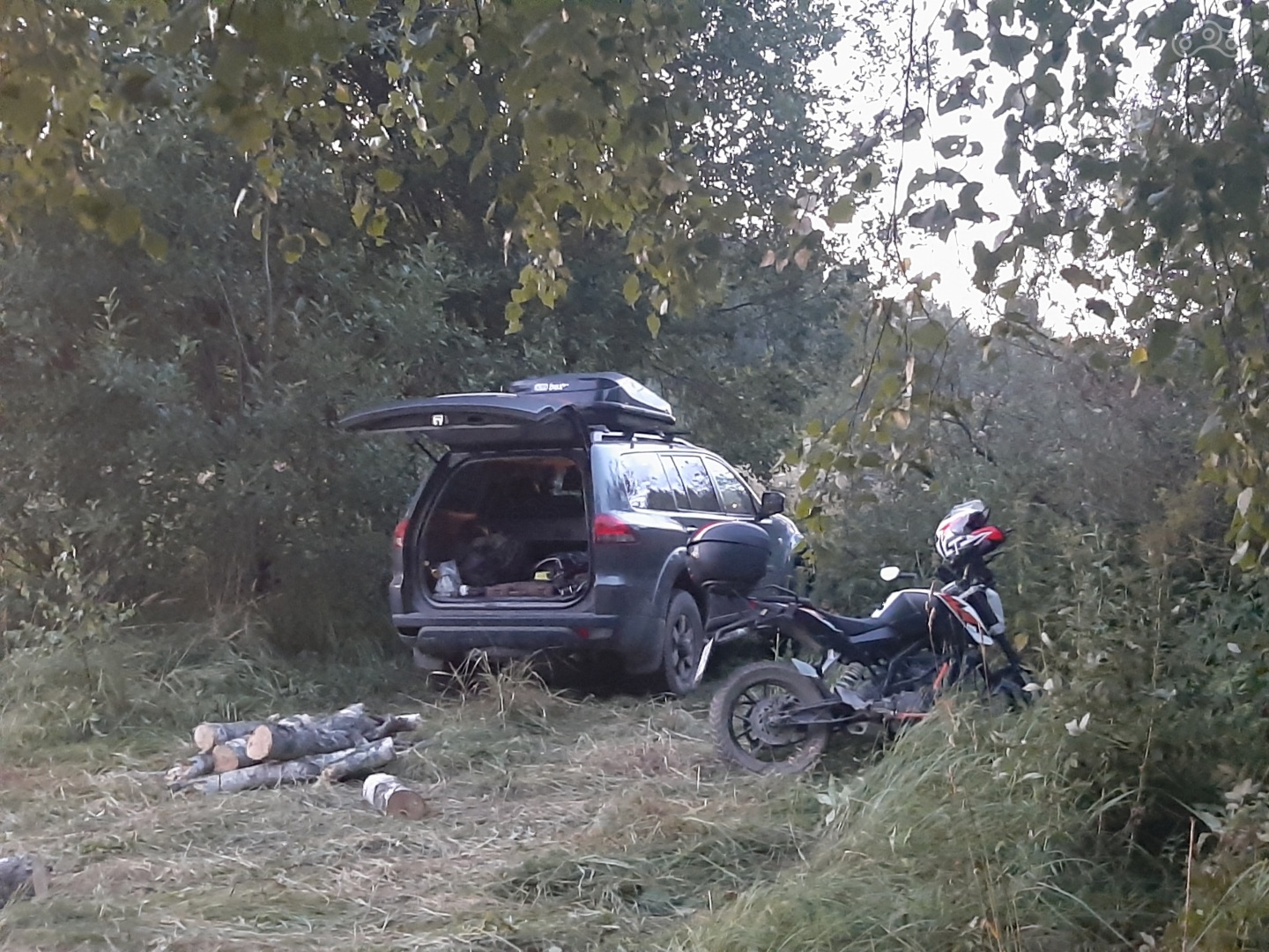 Друзья прибыли на Рузское водохранилище вечером в пятницу, мы же присоединились к ним в субботу. Подобрались к водохранилищу со стороны Курово, подъездная дорога является подразбитой грунтовкой, переходящей в накатанную колею через поле, дорога для любителей эндуро на минималках, альтернативно одаренных мотоциклистов,таких как я, которые ведают множество приемов управления мотоциклом, но не умеют.