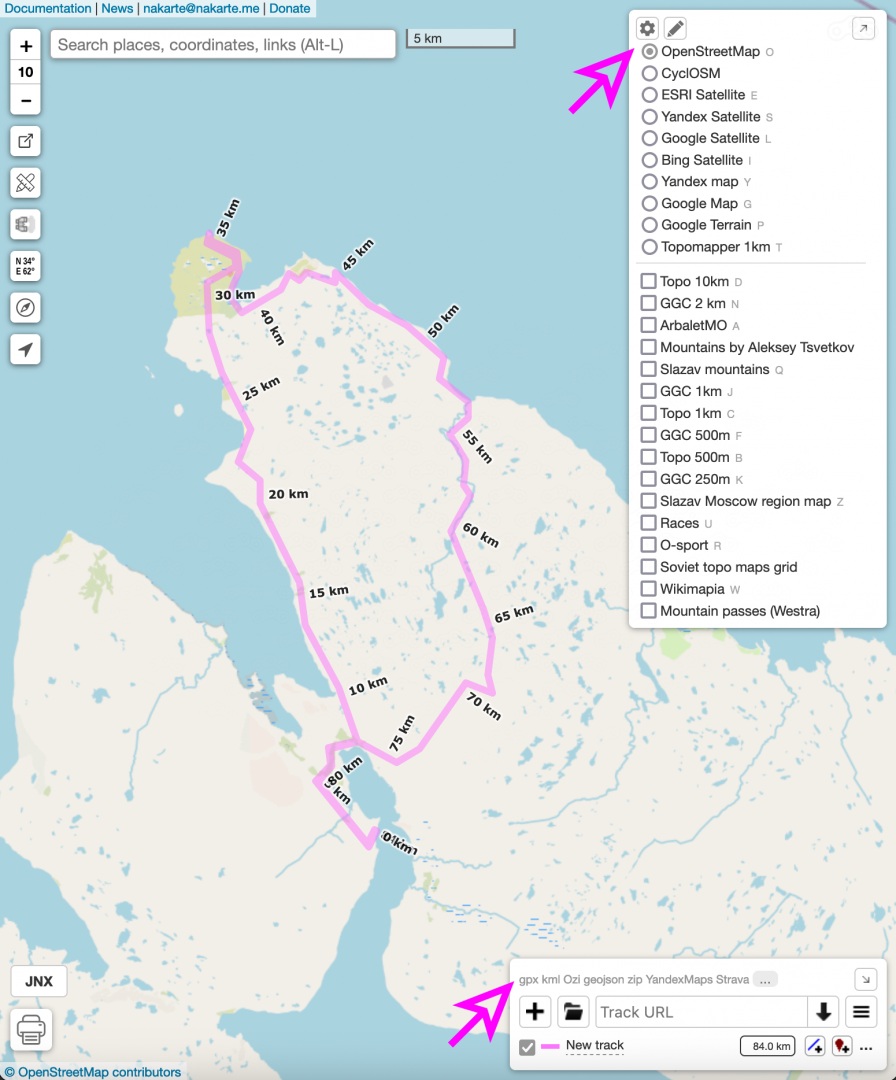 Шаг 1. Открываю онлайн-редактор Nakarte, выбираю слой OSM. Намечаю примерный трек с привязкой к точкам старта и финиша. Проверяю протяжённость — важно, чтобы на мотоцикле хватило топлива, поэтому укладываюсь в 100–120 км. Если трек многодневный, отмечаю АЗС и источники воды. Помню, что после уточнения трек может увеличиться на 20–30%.