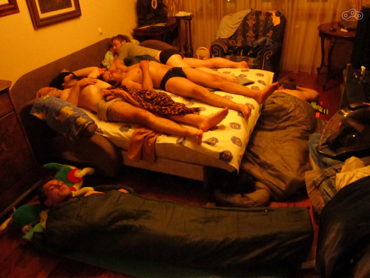 Три часа спустя мы уже выгружали мотики, заносили барахло в квартиру и готовились к ночлегу. Антон, так зовут человека, пустившего 11 немытых и уставших мотоциклистов к себе в квартиру, принес кучу бутылок с непередаваемо вкусным разливным пивом, отварил пельменей и до глубокой ночи мы сидели на кухне за разговорами, периодически теряя срубаемых усталостью товарищей.