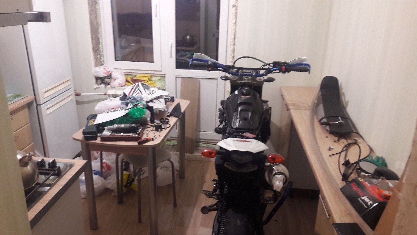 У всего есть окончание. Совсем внезапно завершился и мой сезон. Дожди, промозглый холод, от которого едва спасало военное термобелье. Я с начала августа думал, где будет храниться мой друг. Друг с которым,похоже, полностью стали на одной волне. Различные сервисы, подземные бункеры, гаражи, ангары - выбор огромнейший! Но всё не то.. во многом - способы заработать деньги, сгоняют, как скот в амбар, и зимуют. И где хранить? Сначала согласования с супругой, затем с рыжим котом, никому же не должен, конина такая, мешать. Дома будет жить! Проведя исследования различных форумов, сообществ, узнал о предстоящих мучениях с ароматом бензина и резины. Не буду описывать, как попал F4i на 8 этаж...но он там :) Говорят же, было бы желание :)
