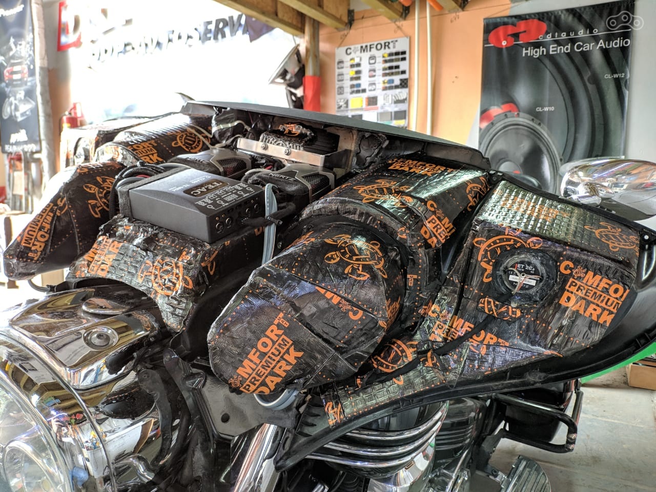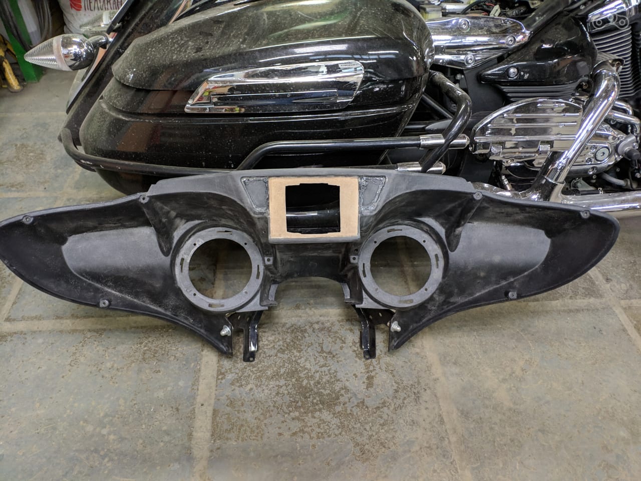 На данном мото нам пришлось внести изменения в лицевую панель бэтвинга, для того чтобы установить головное устройство INFINITY PRV-315.2. Был удалён штатный бардачок и на его месте изготовлен подиум под магнитолу.