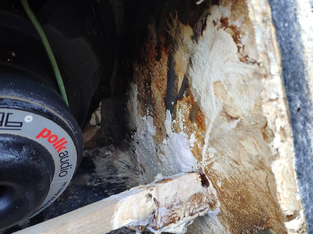 Но самым страшным, что мы обнаружили, это поразившая сабвуфер плесень или грибок, а из пространства между головкой сабвуфера и редуктором нам пришлось доставать семейство дохлых крыс. Никогда ранее мы не сталкивались с такими ситуациями.