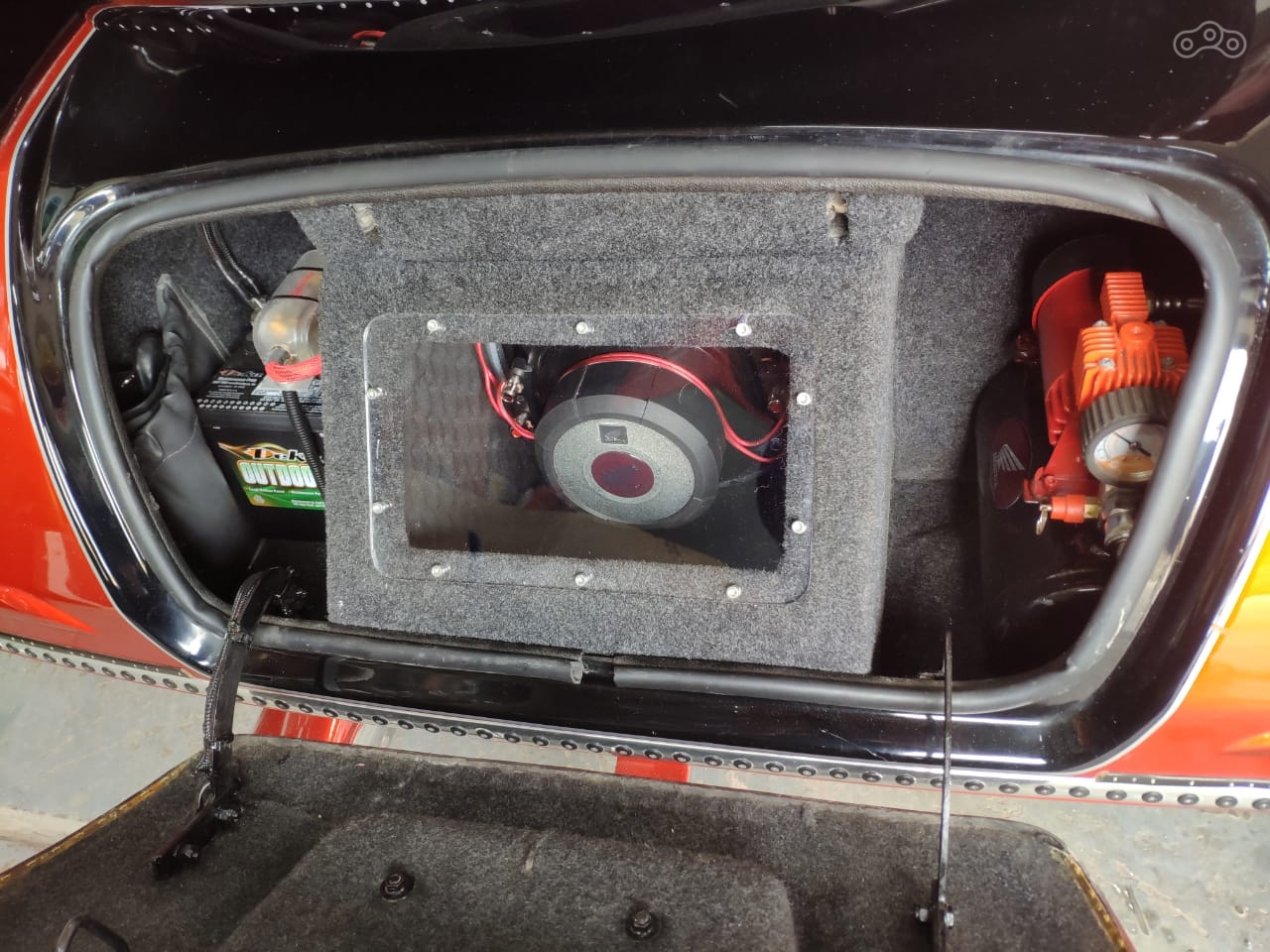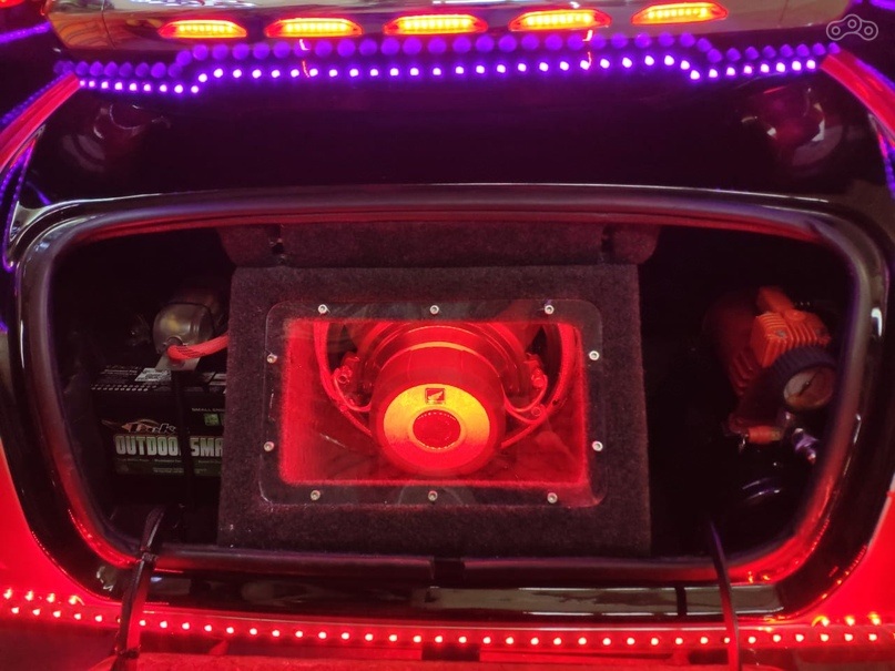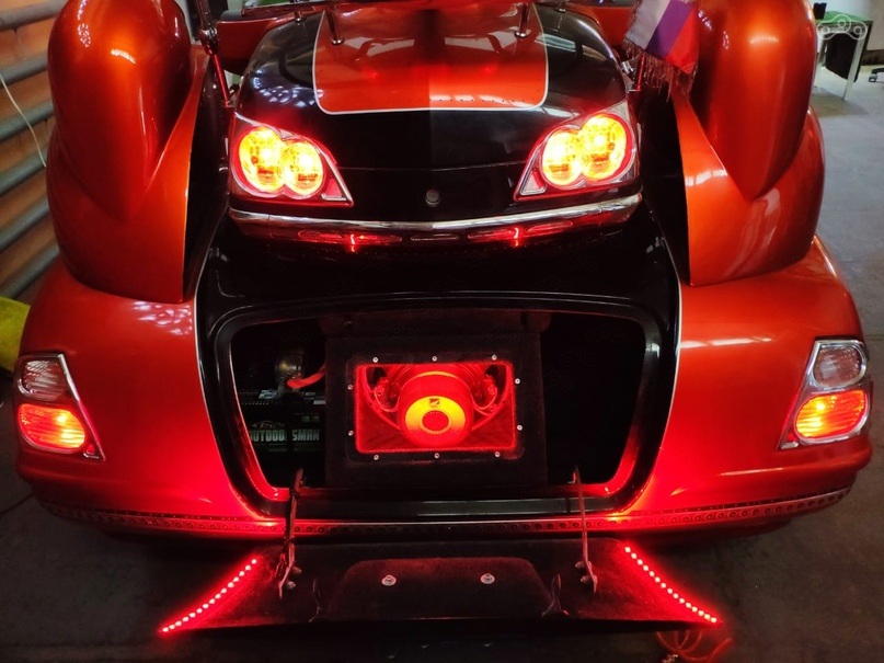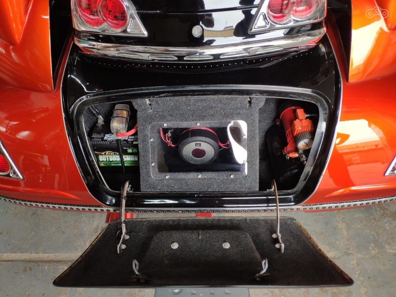 Довольно много сил потратили на изготовление сабвуферного корпуса, так как делать простой ящик в столь неординарный мотоцикл не хотелось, поэтому родилась идея изготовить вот такое необычное изделие, с подсветкой внутри, под сабвуферную голову Pioneer.