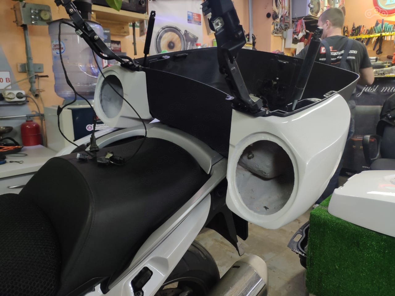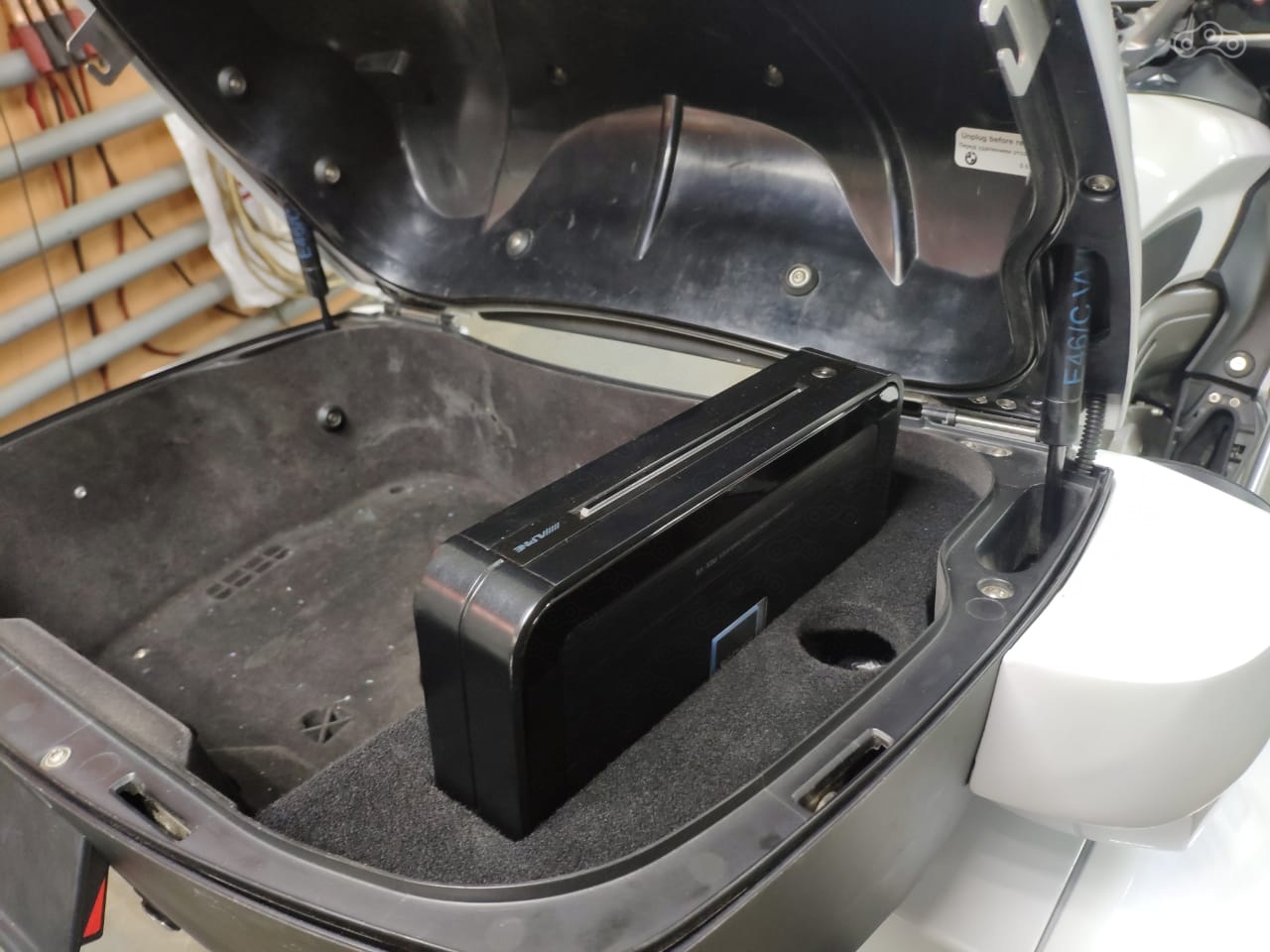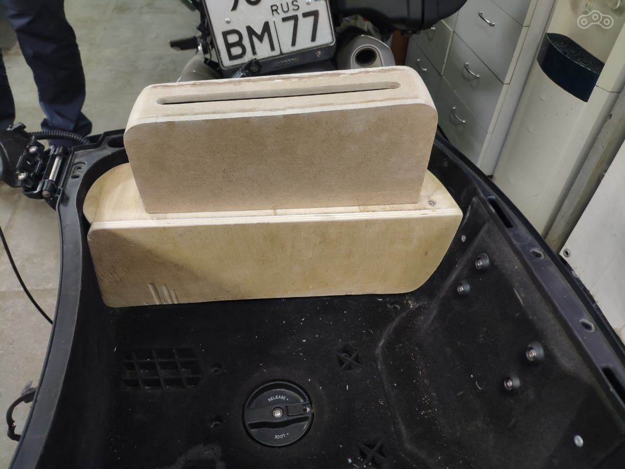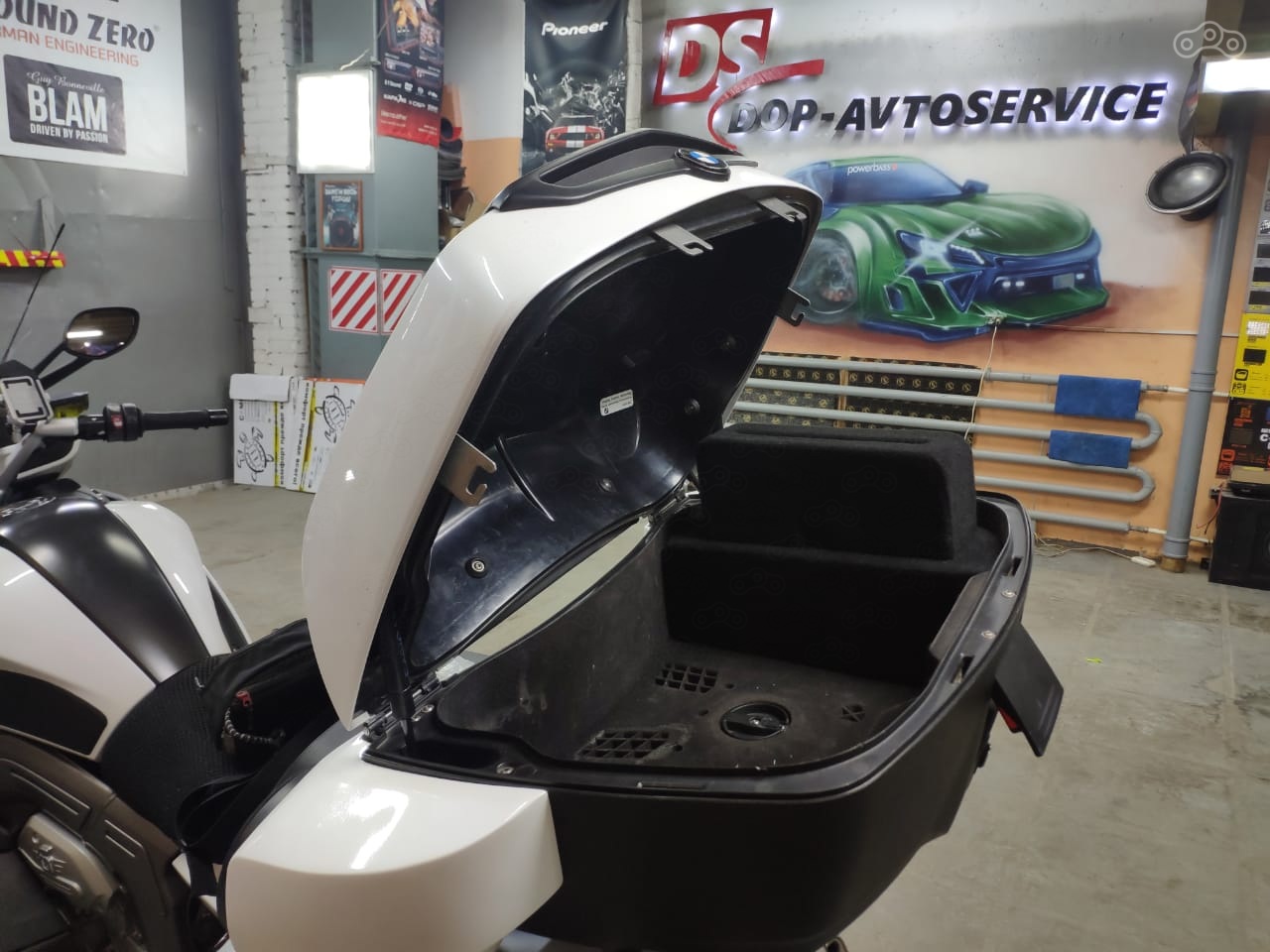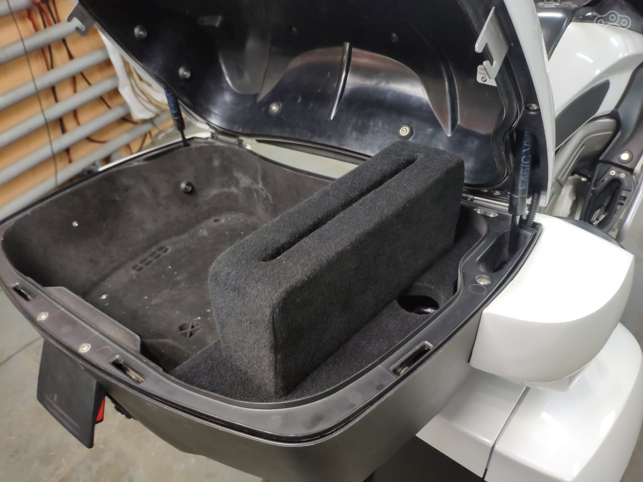 Из левого кофра изготовлен корпус сабвуфера под 10 дюймовую голову ALPINE type R.
