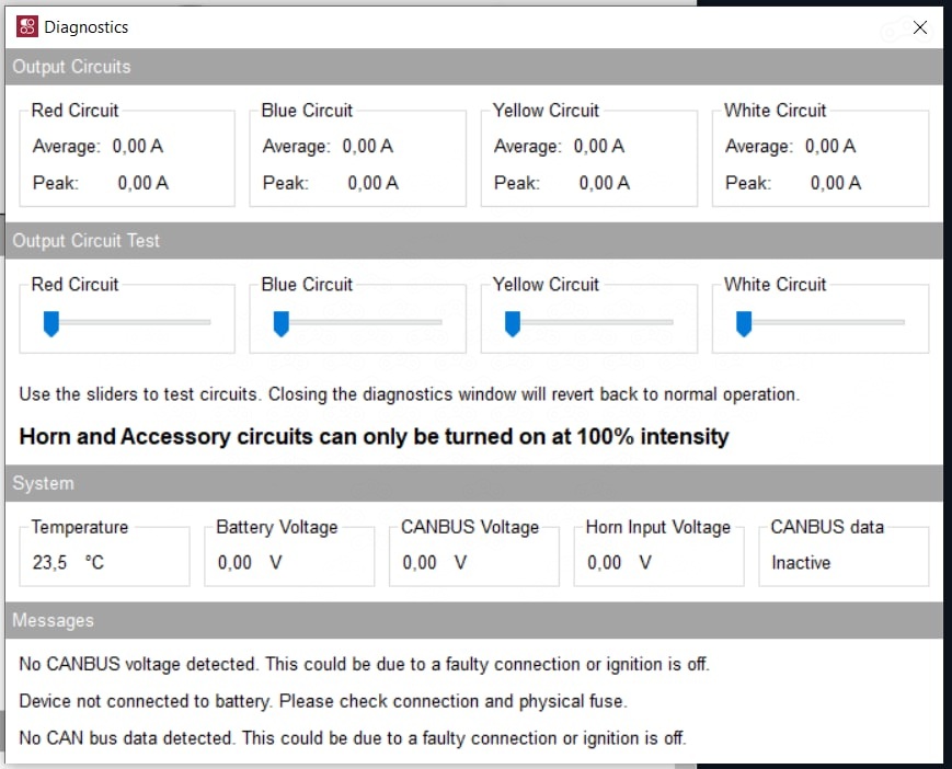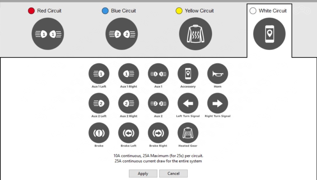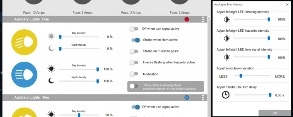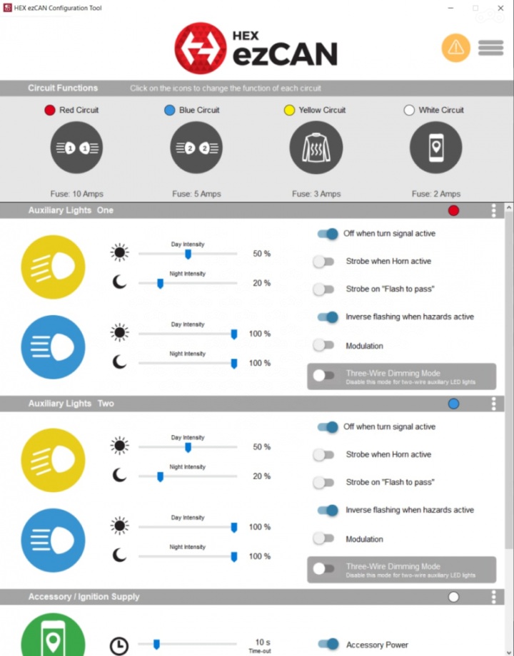 Перед вами — основное окно программы. Curcuit functions — 4 вывода из платы управления, питанием которых мы будем управлять. Скриншоты я делал в процессе настройки, тыкая разные штуки и пытаясь понять, что они делают. Само собой, реальный конфиг отличается. Первый вывод — красный. Для красного вывода на скриншоте назначен предохранитель в 10 Ампер и следующий блок со слов Auxiliary Lights One касается этого вывода. Предположим к этому выводу подключена пара фонарей допсвета. По параметрам на скриншоте эти фонари будут светить вполовину мощности днём и в 20% ночью, если включён ближний. При включении дальнего — включатся на всю мощность. Они будут отключены пока работает поворотник, не будут стробоскопить при активации гудка, не будут стробоскопить при моргании дальним, будут моргать в противовес аварийки, для них не активирована модуляция и отключён трёх-контактный режим.