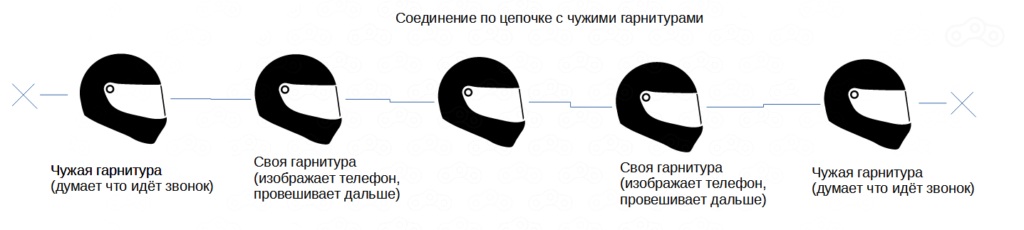Во первых, нужно спарить гарнитуры в определенном порядке. Во вторых, нужно следовать этому порядку и при поездке для уменьшения помех. В третьих, если человек из середины цепочки потеряется (заправка / разрядился / домой и т.п.) то цепочку нужно сомкнуть или будет два куска. При чём сомкнуть это запустить сопряжение, умудрившь объясниться без связи — или остановить всю группу. А если вернулся, а цепочку уже починили — то ему нужно делать сопряжение с крайним, объяснившись на ходу?) Неудобно. Но решение есть: