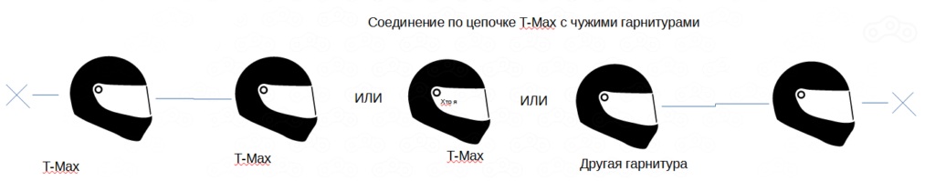 T-Max-T-Max-T-Max-T-Max-Cardo = не будет работать. Кардо может обмануть T-Max но T-Max будет думать что у него идёт «звонок» и на время «звонка» отключит интерком. Тоже самое будет при попытке соединить Senы и T-Maxы всё ещё из-за T-Max. Мы можем работать по предыдущей схеме… но только до тех пор пока количество Тмаксов не превысит количество гарнитур которые могут цеплять хвост.