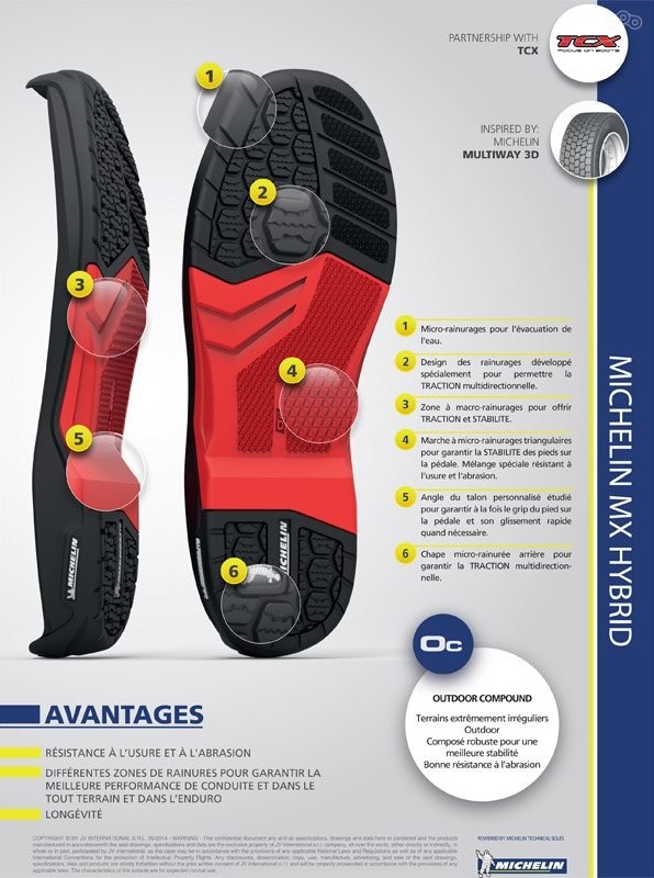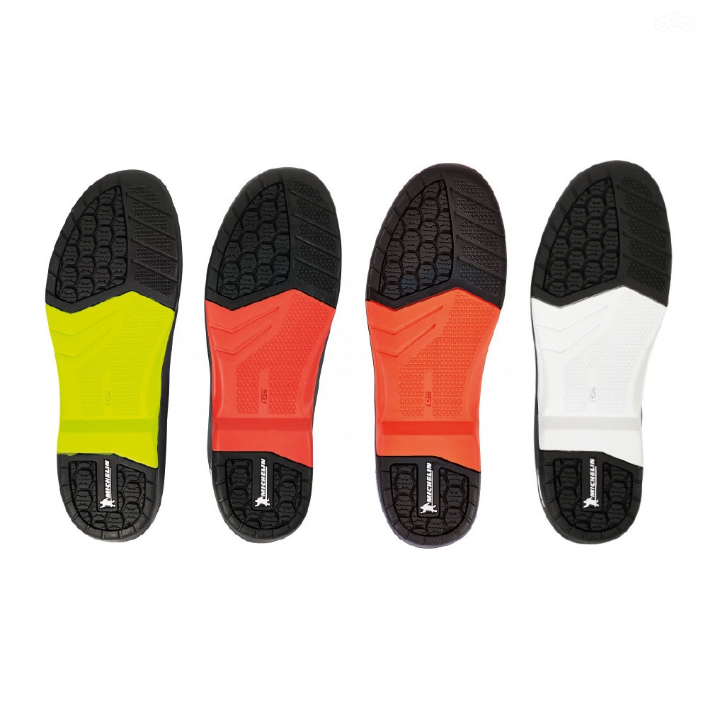 Некоторые линейки и модели мотоциклетной обуви TCX оснащены инновационными подошвами MICHELIN Tech. Данная подошва разрабатывается на основе технологий, применяющихся в шинной индустрии, что резко снижает риск получения травм.