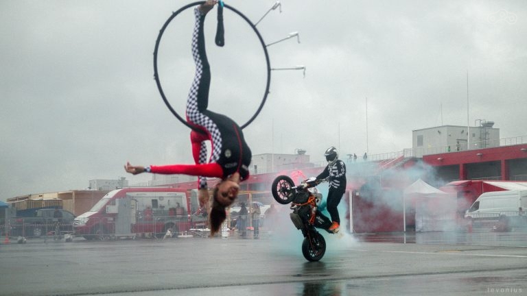 Зажигательный дрифт, синхронное исполнение сложных элементов и вращений, «фламинго» на квадроциклах и мотобалет – ребята показали высшее мастерство не только на главной площадке во время выступлений, но и на тренировочных заездах. Зрители и болельщики также с большим удовольствием посмотрели коронный номер, в котором совмещаются, казалось бы, несовместимые вещи – выступление стантрайдеров и хрупких воздушных гимнасток. Компания Stunt Buro впервые показала этот номер в прошлом 2017 году на финале RSBK, с тех пор шоу пользуется неизменным успехом.