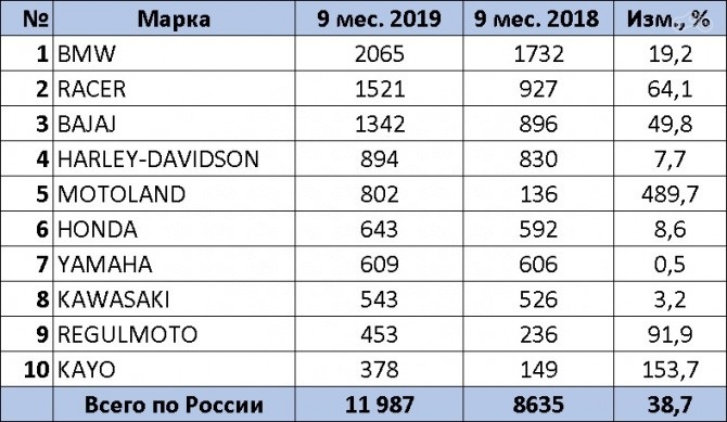 В вышеприведённой таблице они перемешаны, и приведены общие цифры по обоим рынкам вместе взятым. Но нам ведь ничего не мешает по данным первой таблицы составить ТОП 5 Российского рынка настоящих мотоциклов: