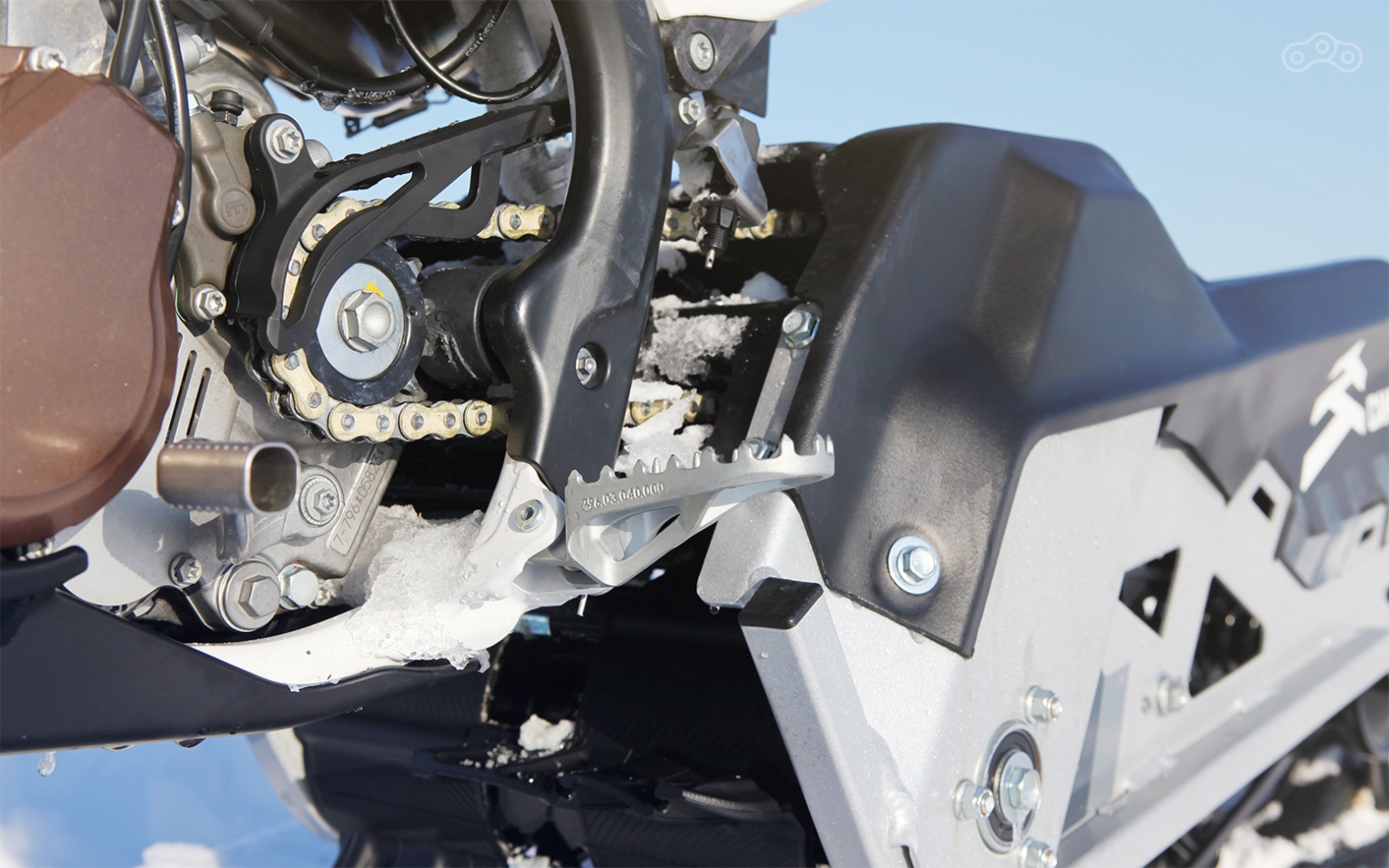 В основе доставшейся нам конфигурации сноубайка лежит эндуро Husqvarna FE501 и его потенциала, как мне показалось, хватает с трудом, но 701-я, к сожалению, с гусянке Camso не подходит из-за иной конструкции маятника. Само собой, выбор байка-донора не ограничивается одной лишь «Хускварной»: ничто, не считая ценника в 340 тысяч рублей за комплект из лыжи и гусеницы, не помешает владельцам внедорожных KTМ превратить свои оранжевые тыквы в такую же роскошную снежную карету.