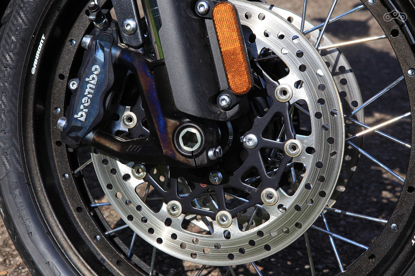 А вот кардан с редуктором отличаются разве что небывало скромными люфтами, порой вообще кажется, что едешь на цепном мотоцикле. По крайней мере, пока не прислушаешься и не услышишь вой трансмиссии, тут она довольно шумная. Но, все в пределах разумного. Что же до тормозов, то моноблочные 4-поршневые оппозитные суппорты Brembo с радиальным креплением – огромный шаг вперед.