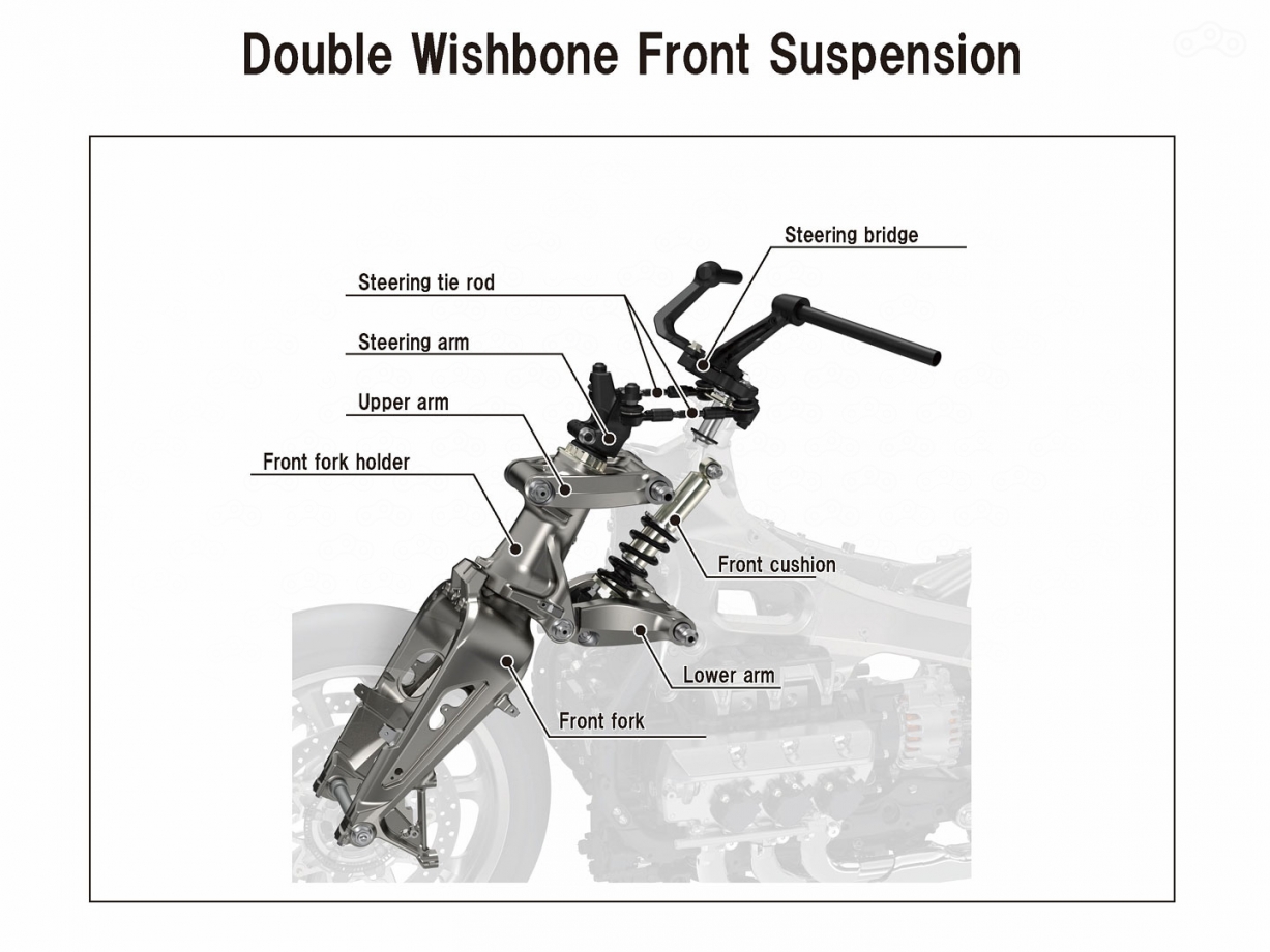 Переднее колесо крепится на алюминиевом поворотном рычаге, установленном в своей рулевой колонке, которая, в свою очередь, крепится к раме через нижние рычаги и амортизатор. Верхние же рычаги на шарнирах идут непосредственно к рулю, закрепленном в своей собственной рулевой. Выглядит эта конструкция фантастически, да и двигающиеся следом за рулём и колебаниями подвески верхние рычаги очаровывают.