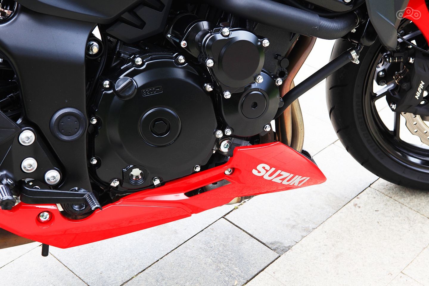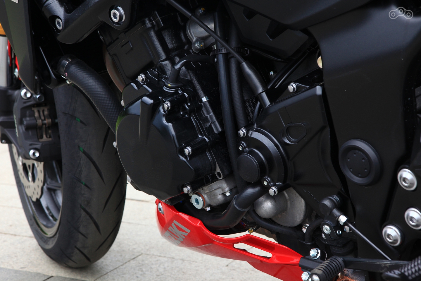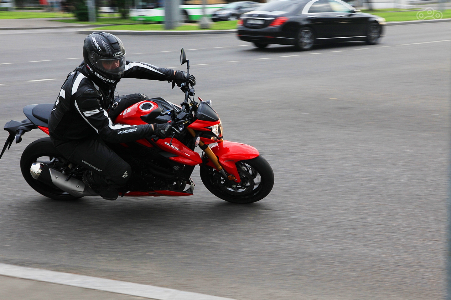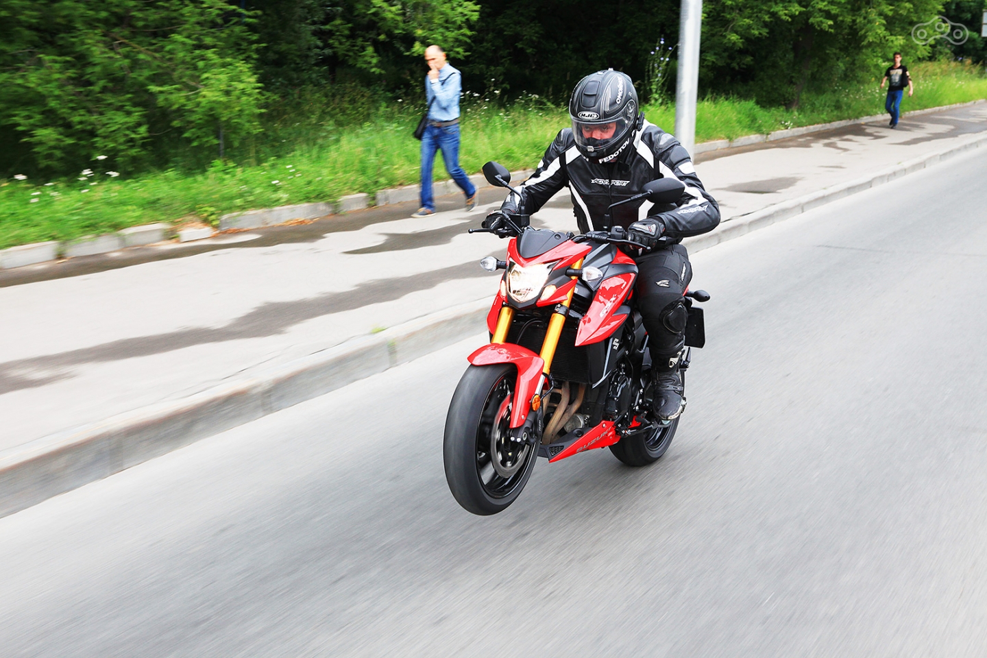 Коробка работает чётко, нейтраль ловится на раз, да и к включению остальных передач вопросов нет. Передаточные числа не слишком отличаются от 750-кубового «Джиксера», первая передача заканчивается примерно на сотне километров в час, и претензий к их подбору не возникает. Так же, как и к настройкам мотора – дефорсированный до 114 лошадиных сил силовой агрегат отличается ровным крутящим моментом и неплохой тягой в середине.