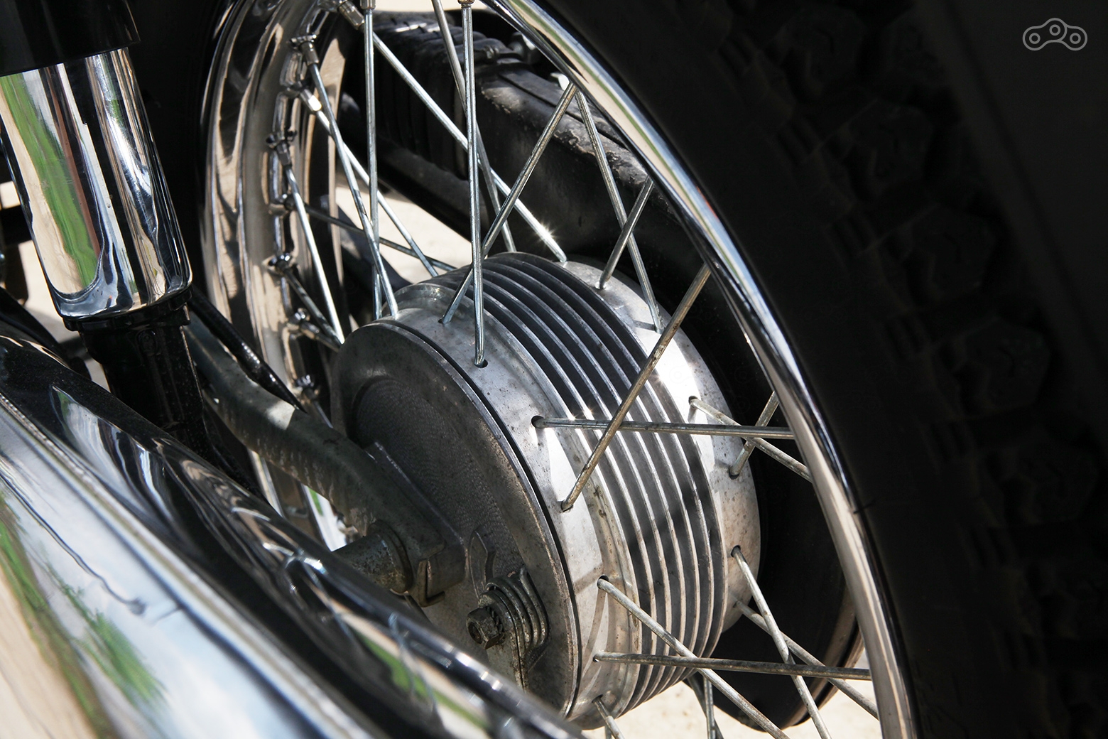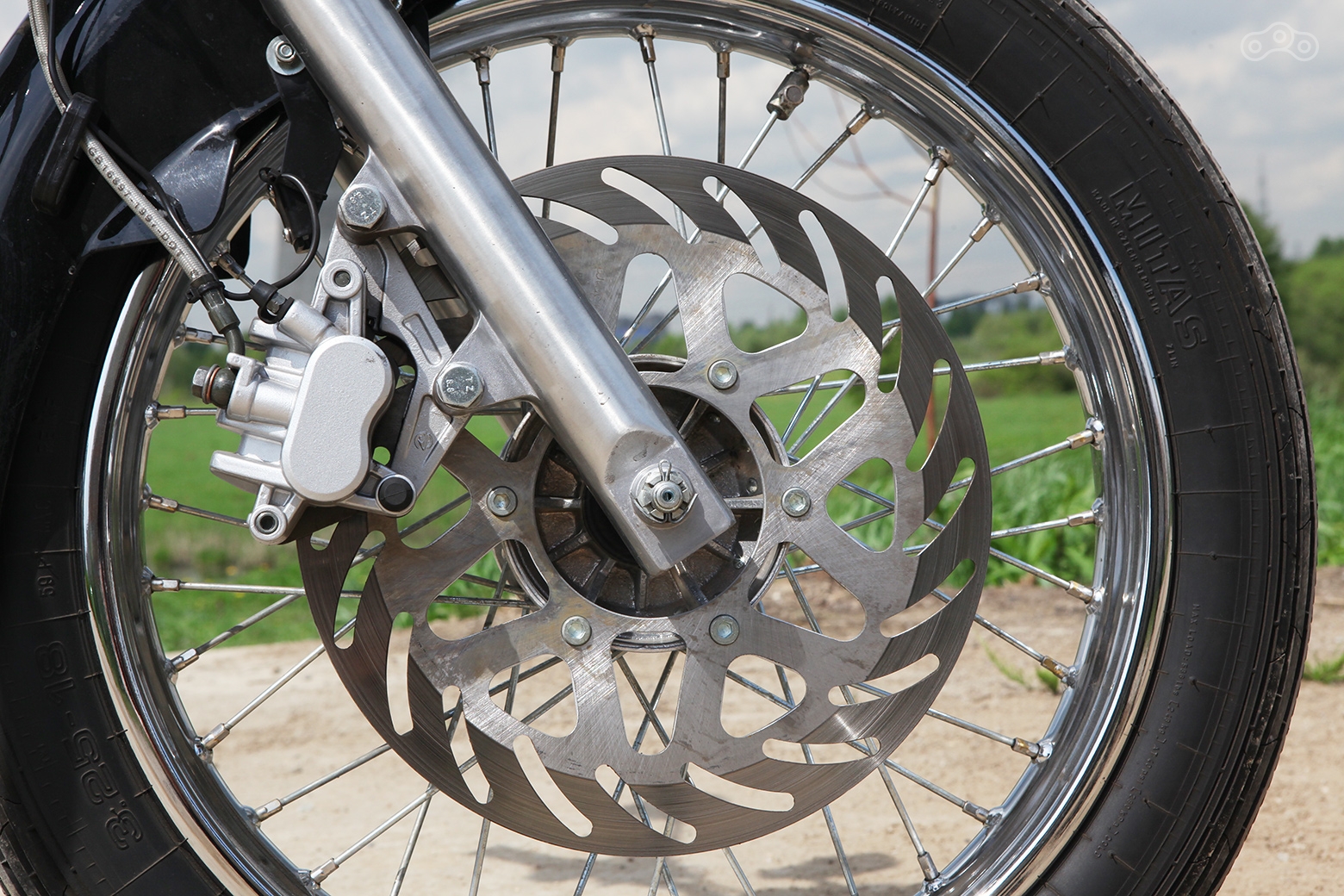 С ними ведь нельзя сравнивать мотоцикл из прошлого? Ведь сразу окажется, что и тормозов тут немного, хотя они и есть: спереди один диск с двухпоршневой плавающей скобой, сзади оригинальный «барабан» с довольно мягкой, но слишком уж высоко поднятой педалью – для того, чтобы нажать на нее, приходится отрывать ногу от подножки. В это же время рычаг переднего тормоза, наоборот, слишком жёсткий и не прозрачный: давить приходится очень и очень сильно, получая в ответ не очень линейное замедление.