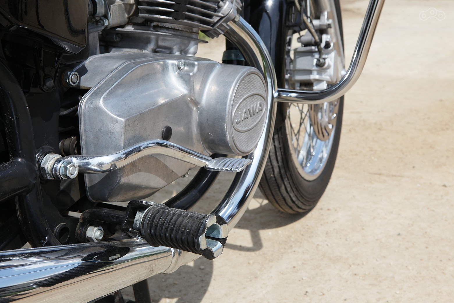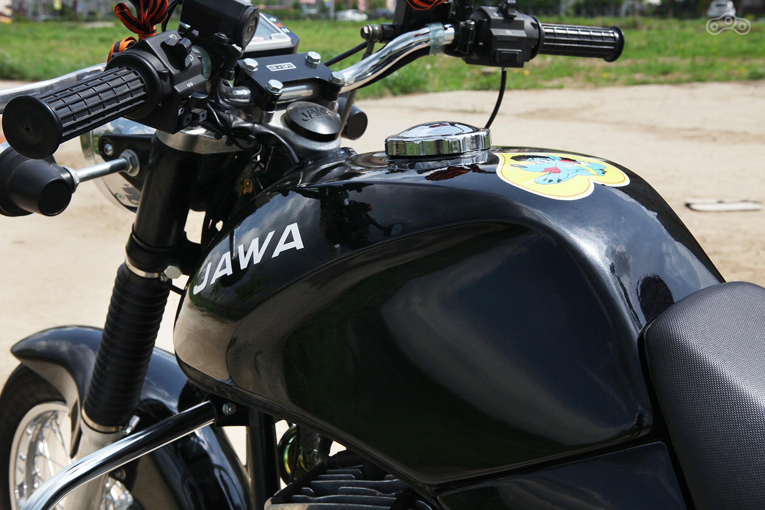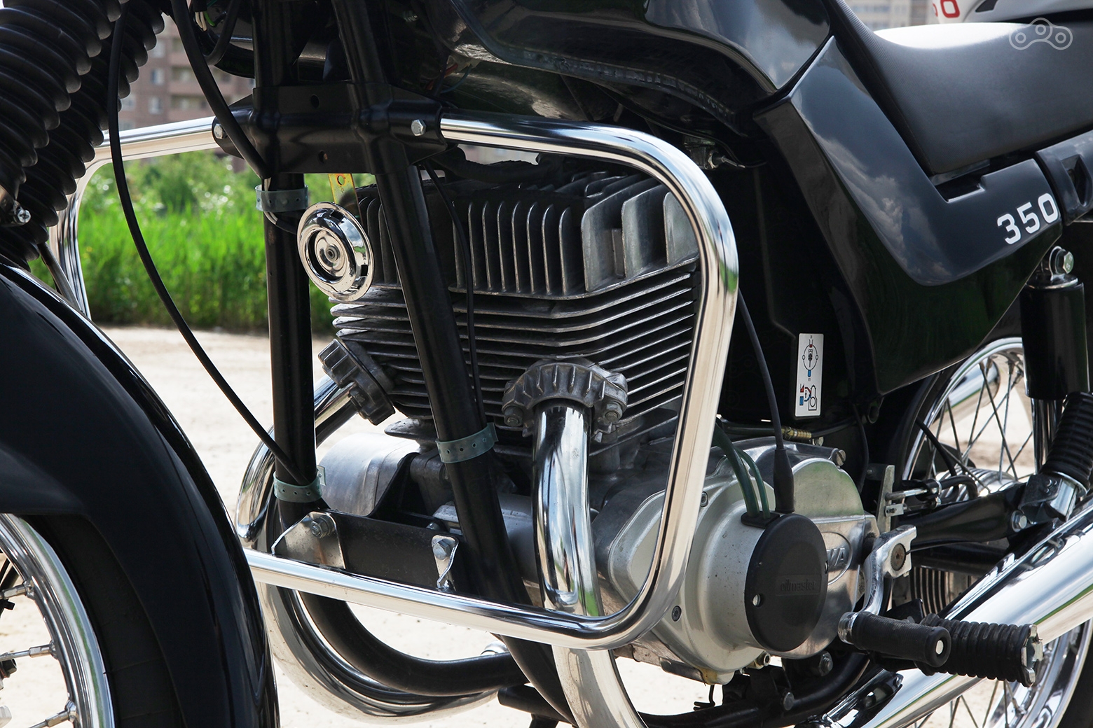 Впрочем, доработать дисковый механизм, при желании, проще, чем барабанный. Это же касается и подвесок, ведь сегодня ничего не мешает залить в вилку масло погуще. Зато колеса на спицах и хромированных ободах, глушители и олдовые поворотники с блестящими ободками смотрят вверх, цепь, спрятанная в фирменный «явский» кожух и красивый алюминиевый картер двигателя задают настроение, которого не добиться тюнингом чего-то другого.