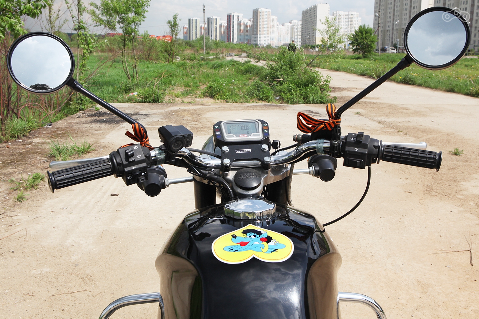 Особенно такие «современности» контрастно выглядят на фоне олдовых пультов, бобышки переключателей которых ходят на стальных ножках, и, хромированной пробки бака, не менявшейся, кажется, с 60-х годов. Это же касается и старых, оригинальных «явских» ручек руля, и рычагов – мелочей, создающих настроение и только обостряющие тактильные ощущения от этой машины времени.