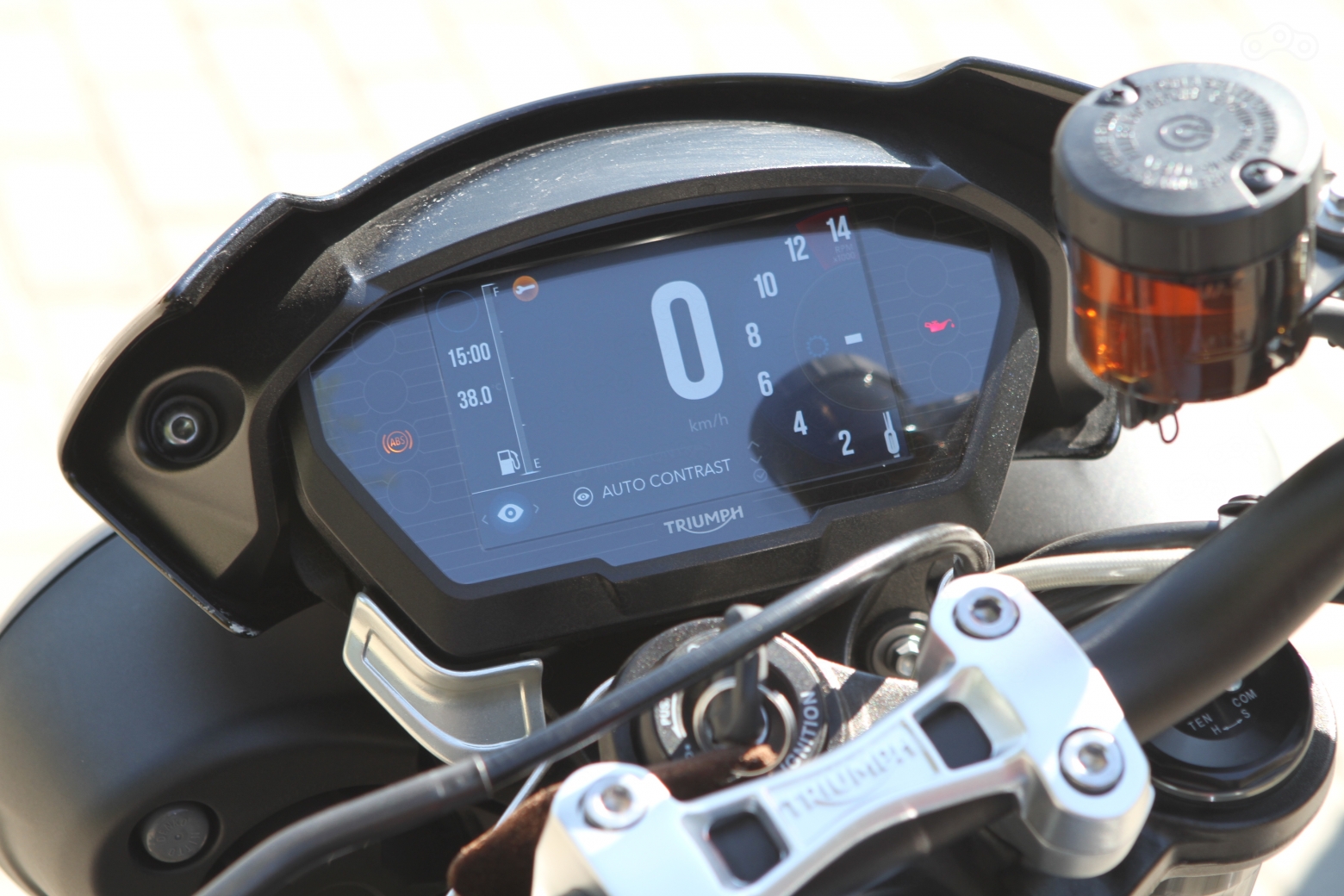И хотя «завтрашним днем» это перестало быть ещё несколько лет назад, свыкнуться с мыслью о том, что я дожил до момента, когда на мотоцикле будет стоять целый компьютер с цветным монитором, пока не выходит. Короче, панель приборов Street Triple впечатляет и функционалом, и графикой. Пока впечатляет, но через несколько лет так будет у всех. Почти так – фирменная «триумфовская» регулировка угла наклона монитора, вероятно, так и останется британской фишкой, очень уж не очевидна её польза.
