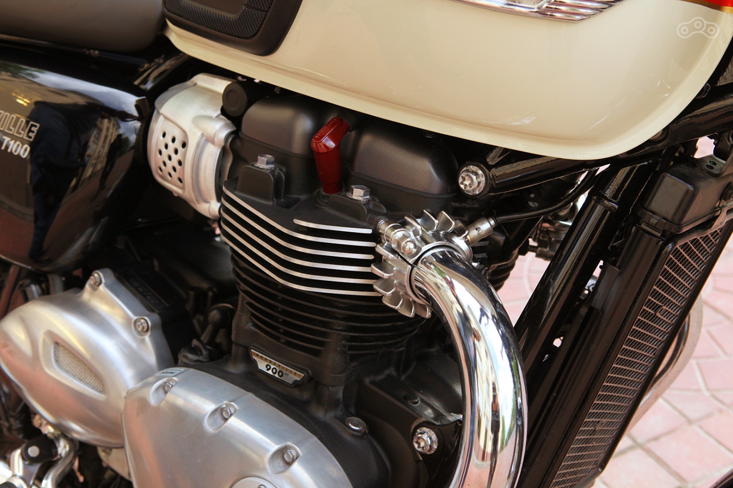 Параллельная двойка – объект поклонения и главный фетиш всех поколений фанатов британской конструкторской школы, отныне оснащается жидкостным охлаждением. Но к чести англичан, узнать об этом придется не скоро, возможно, спустя несколько лет после покупки: масляный радиатор предыдущего Т100 на новом сменил водяной, чуть большего размера. Рубашка охлаждения цилиндров умело спрятана за развитым оребрением цилиндров, а расширительный бачок вообще вряд-ли удастся найти без мануала.