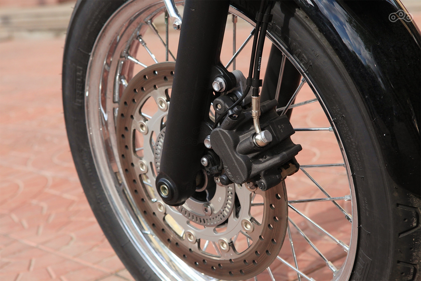 Тормоза – простые плавающие двухпоршневые скобы, которые на удивление хорошо работают, во многом благодаря армированным тормозным шлангам и добротным главным тормозным цилиндрам. Да и скорости уже не те что в «шестидесятых», так что нынешнему поколению Bonneville достаточно и одного тормозного диска спереди.