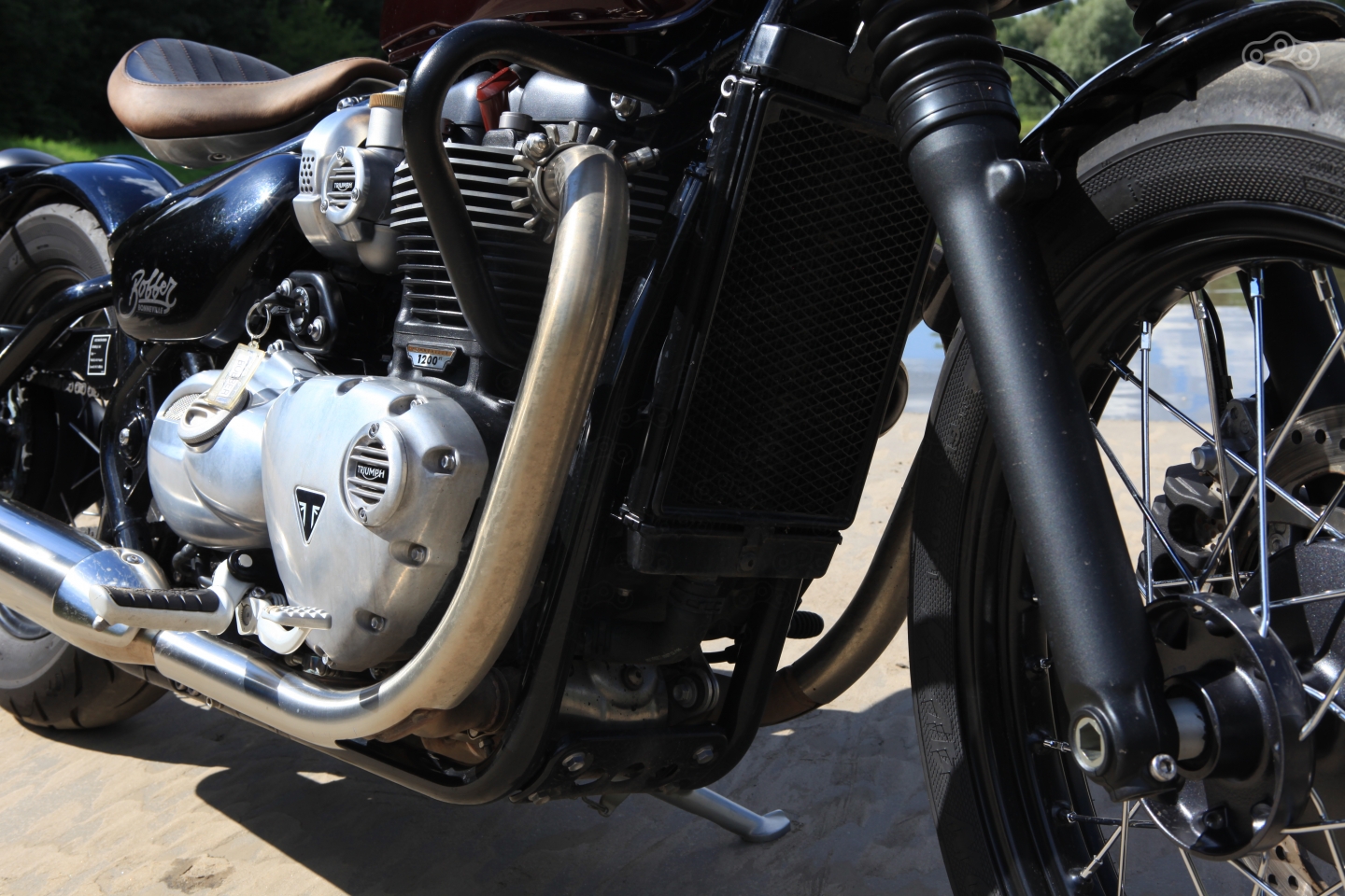Именно наслаждаться, потому как 1200-кубовая «двустволка» никак не сочетается с банальной ездой из точки А в точку Б. Особое удовольствие доставляет благородное рычание штатных прямотоков, ненавязчивые вибрации и 106 Нм крутящего момента, доступные с четырёх тысяч оборотов обеспечивают паровозную тягу. К слову, специально для Bonneville Bobber мотор несколько переработали, как раз сместив показатели пиковых значений мощности к «низам» и повысив крутящий момент.