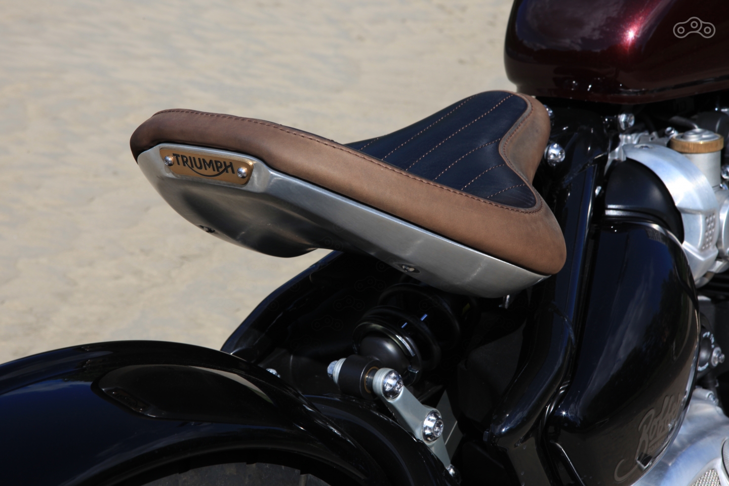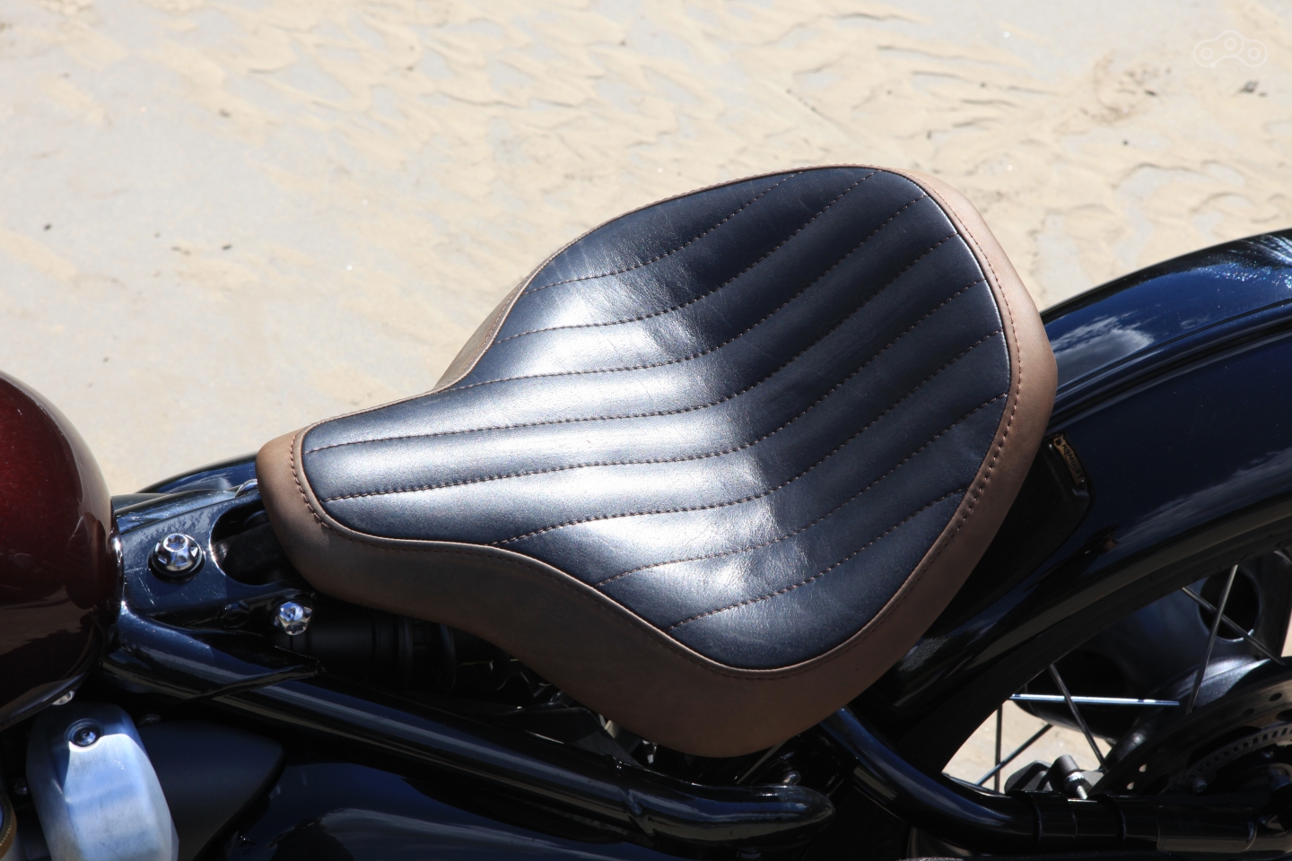 Сам бак довольно узкий, и в отличие от других моделей «Бонни», с которыми топливная ёмкость «Боббера» унифицирована, резиновые нигрипсы на боках ему не положены. Именно поэтому сжимать коленями бак не очень удобно, но, даже если вдруг получится – зацепиться будет не за что. Ну и плевать, оно все равно того стоит! А когда кожа протрётся в одних местах и отполируется в других, седло будет выглядеть ещё круче, будто бутылка вина, пролежавшая в погребе не один десяток лет.