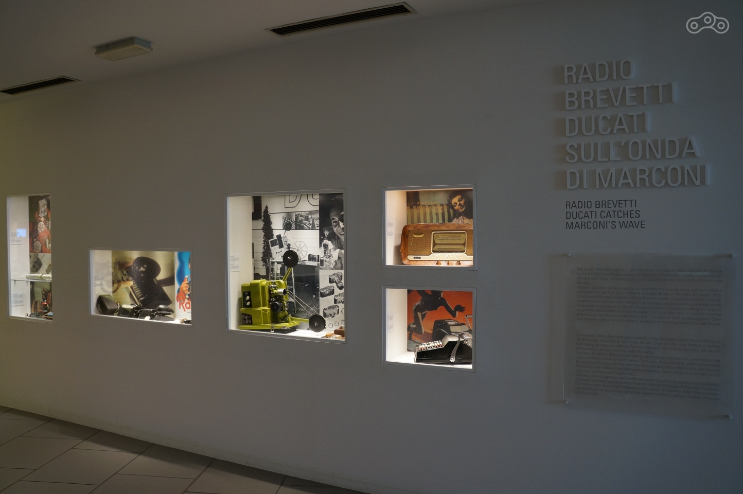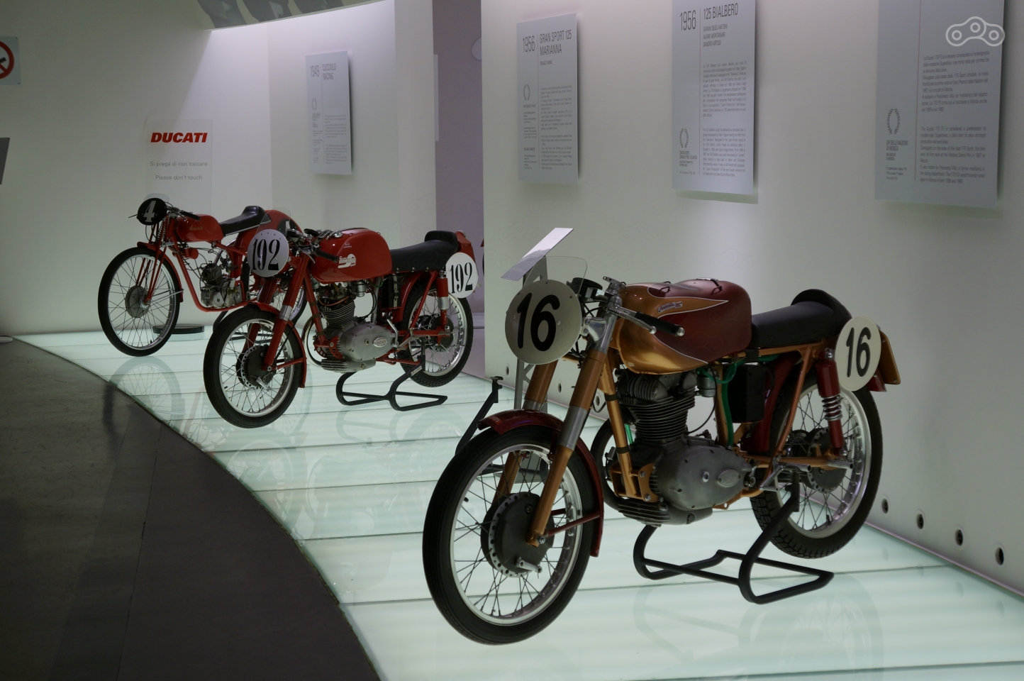 Помещение музея овальное, посетители ходят между залами с серийными моделями через полукруг гоночных мотоциклов бренда, расставленных в хронологическом порядке, от первых 125-кубовых аппаратов середины прошлого века до последних болидов Moto GP, завершающаяся стендом с кубками и трофеями разных лет.