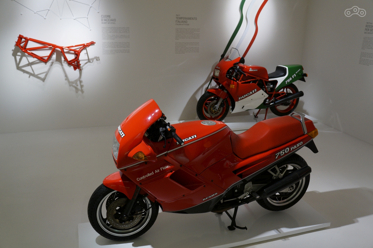 Ему в музее уделено особое внимание – на стене рельеф эквалайзера рева мотора, он же раздается из динамиков, стоит подойти к мотоциклу поближе, а неподалеку – отдельно стоящий мотор и стенд с десмодромным ГРМ в разрезе, который любой желающий может собственноручно покрутить, увидев кинематику коромысел, опускающих и поднимающих клапаны без пружин.