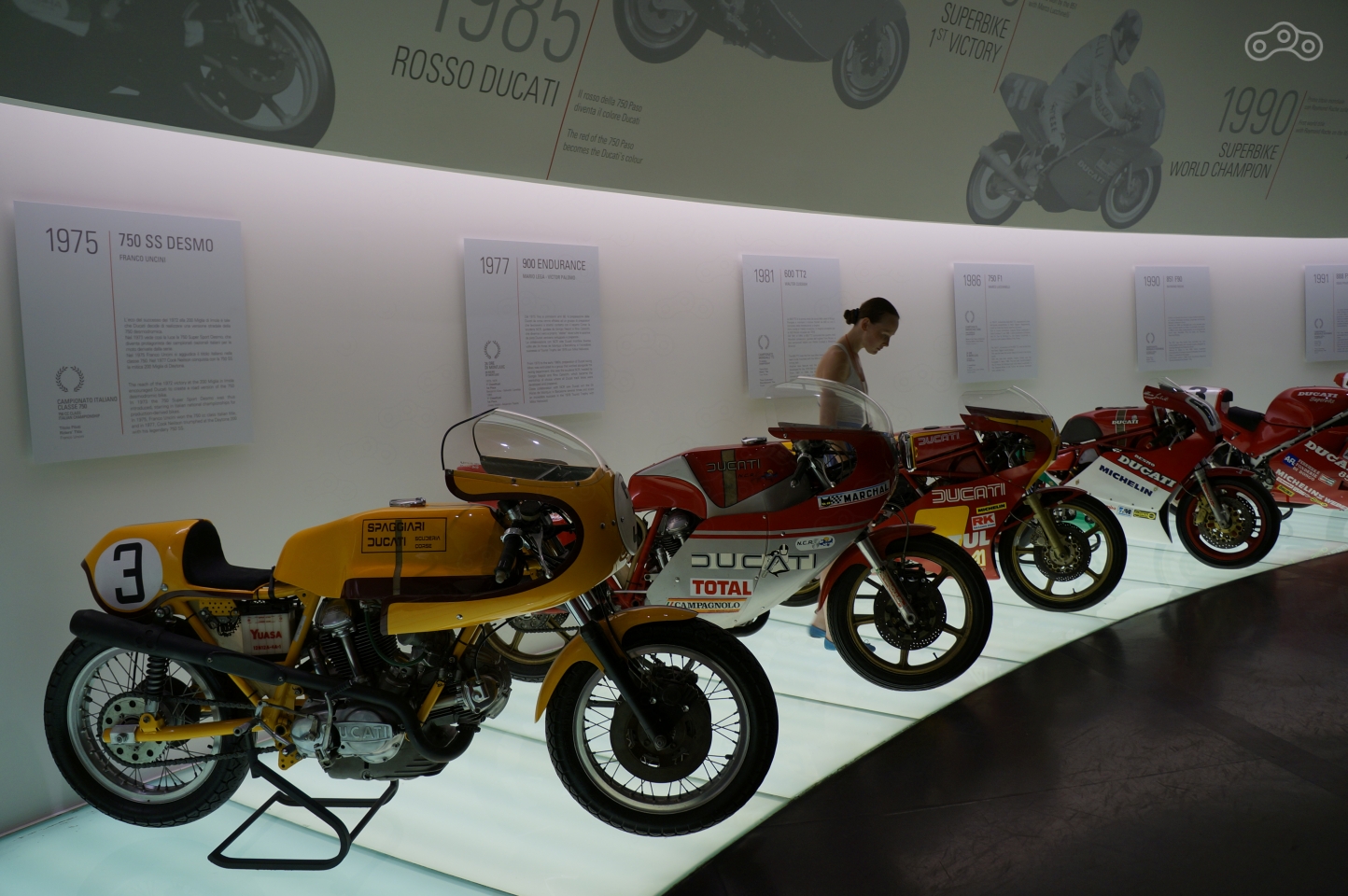 Именно ему посвящен следующий зал, в дальних углах которого представлена лимитированная серия Superlight культового Ducati Super Sport 1988 года и супербайк Ducati 851, мотор которого, впервые в истории компании, получил 4-клапанные головки и имя Desmoquatro.
