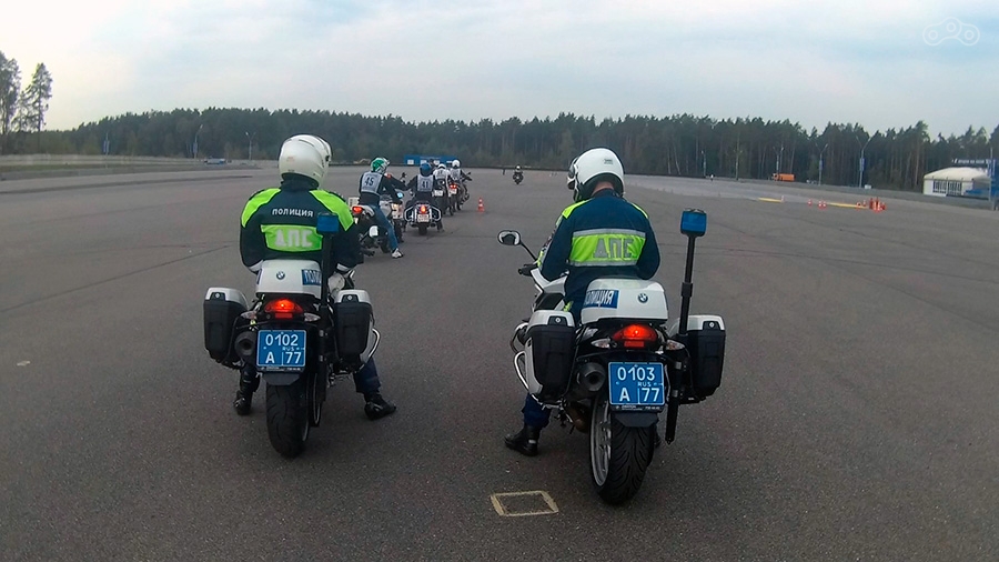 Инструктора отвечают на вопросы, после чего перемещаемся на площадку, где, опять же, сначала инструктор на мотоцикле снова показывает как проходить каждое упражнение, а только потом упражнение начинает выполнять группа, под внимательным контролем нескольких инструкторов.