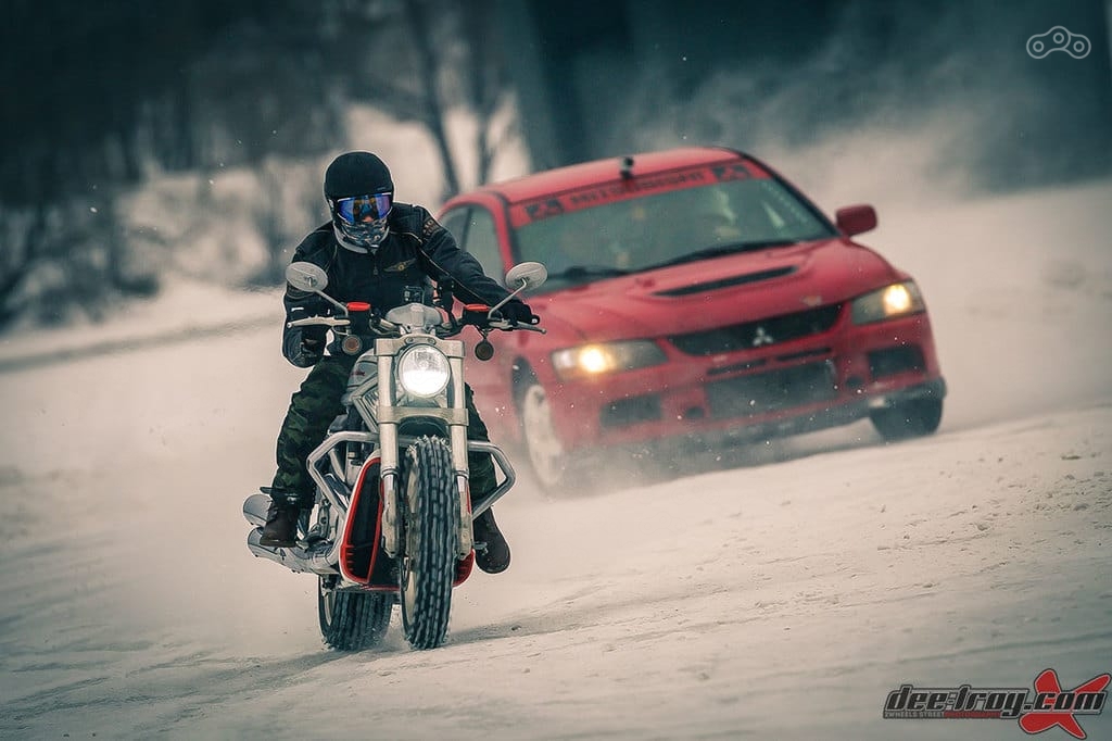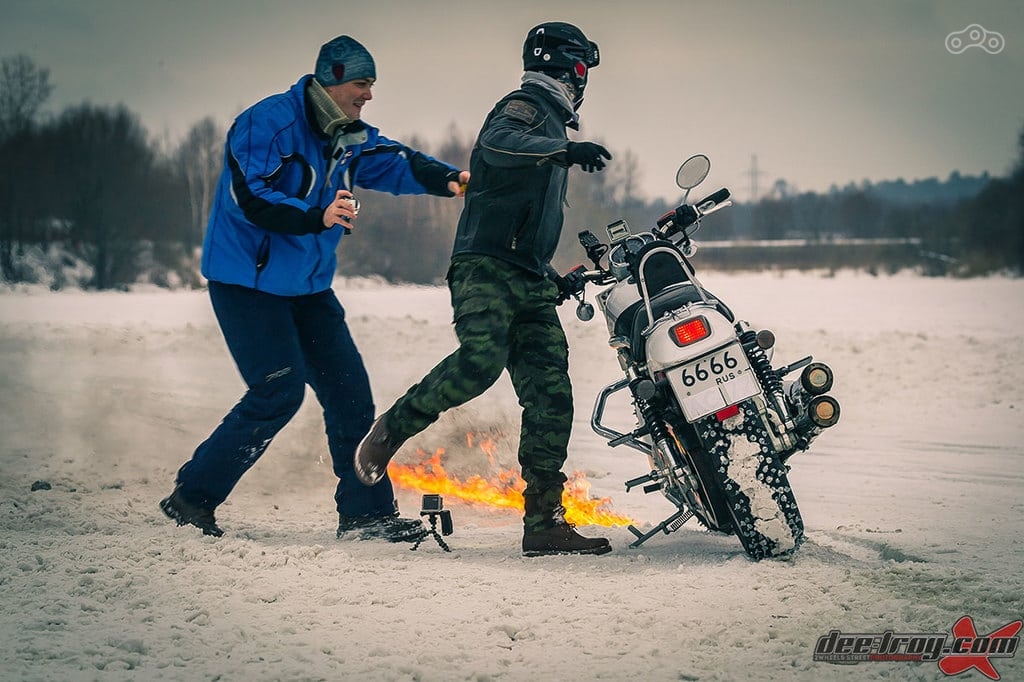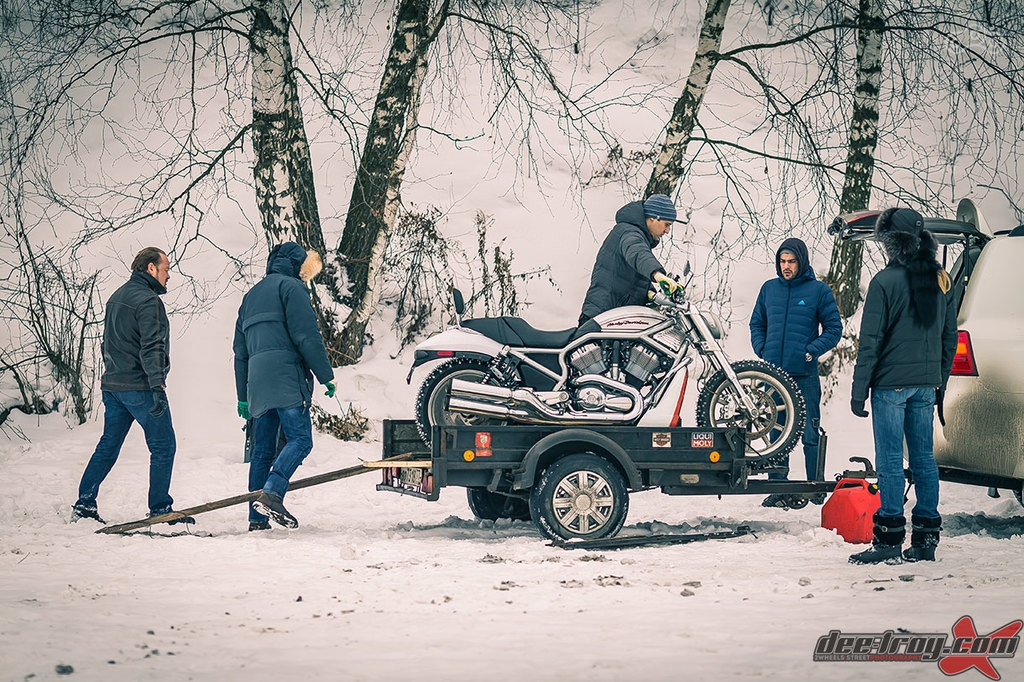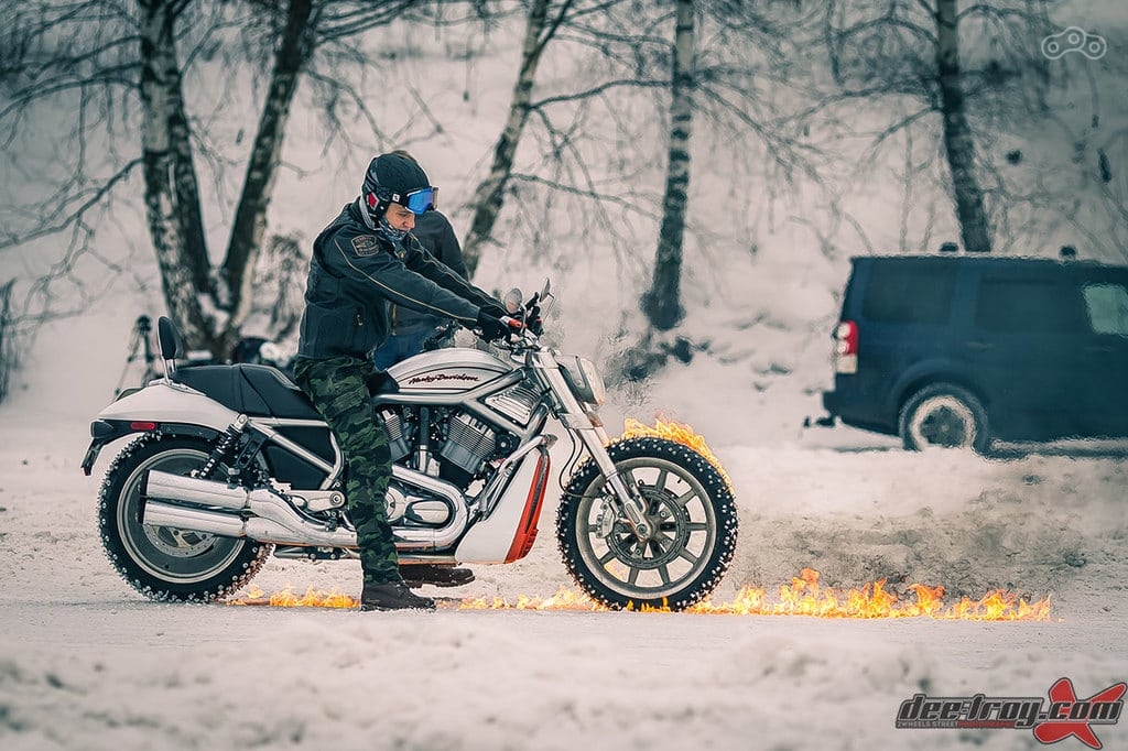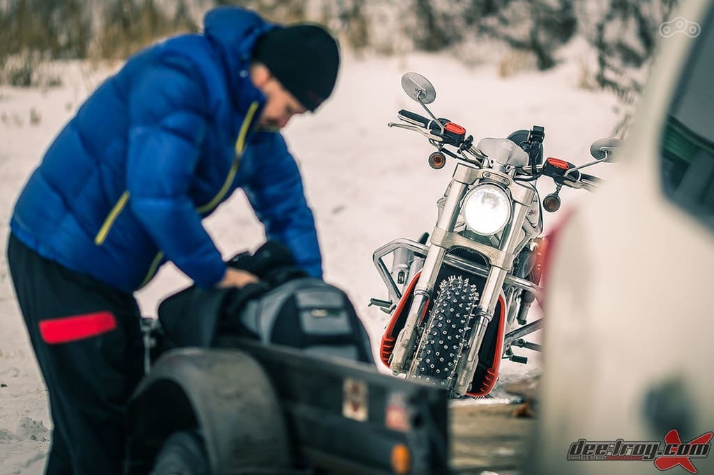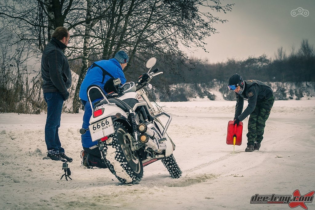 Ну и поскольку я всегда за любой кипиш, включая голодовку, если это пойдет на пользу делу, то когда он написал мне несколько недель назад, что хочет воткнуть себе на Харли шипованные покрышки и погонять по льду Москва-реки, разумеется, не отказался весь процесс поснимать.