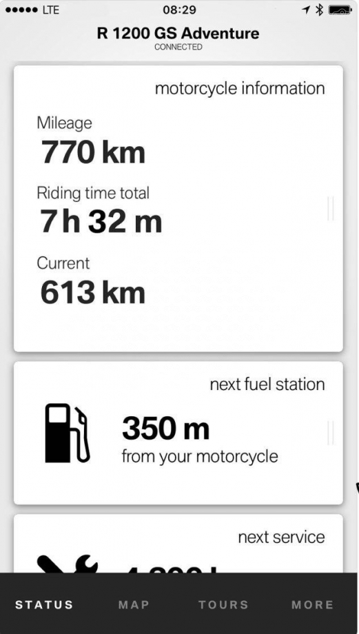 Для BMW есть такое же, но они немного топорное. Из функций там только функция с мажорными названием "Мои мотоциклы", есть ещё зарегистрированные поездки, данные с мотоцикла (пробег, расход и тому подобное). СТО и заправки. А еще туда засунули навигатор с бесплатными картами.