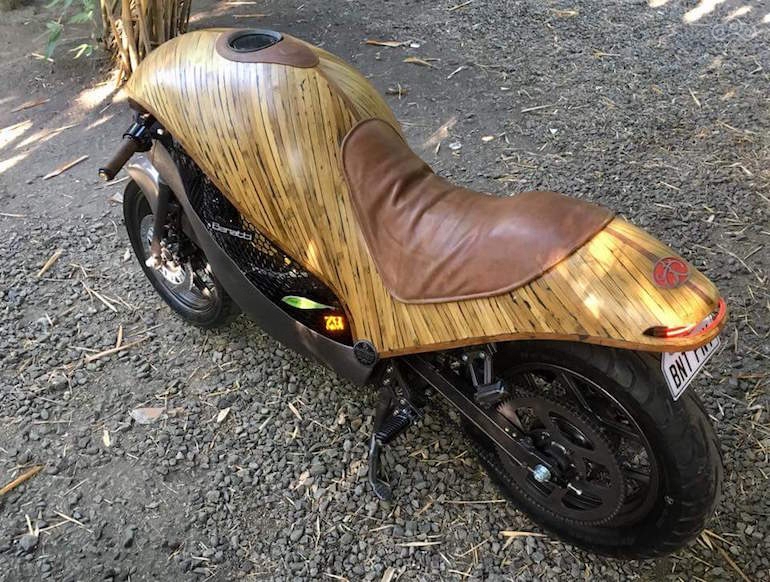 Электробайк с бамбуковым кузовом под названием «Зелёный сокол», к слову сказать, анфас этот аппарат действительно походит на хищную птицу, по словам Кристофера, выигрывает в весе у такого же аппарата но со стекловолоконным кузовом почти в полтора раза.