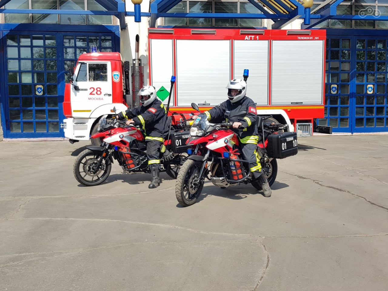 На днях в Москве состоялись показательные выступления пожарных на мотоциклах. Принявшие участие в мероприятии BMW F700GS были окрашены в красный цвет, укомплектованы огнетушителями, водяной пушкой с баллоном и рукавом и необходимыми средствами для оказания первой медицинской помощи. Кроме того, на мотоциклах, участвовавших в показательных выступлениях, была установлена светосигнальная аппаратура и инструментальный ящик.