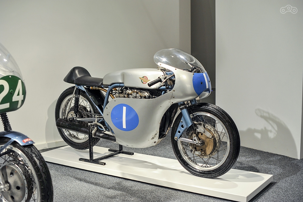 В центре экспозиции – три гоночных мотоцикла, построенных в промежуток между 1958 и 1960 годами Фабио Тальони, послуживших отличным стартом спортивной карьеры одного из самых титулованных гонщиков – Майка Хейлвуда.