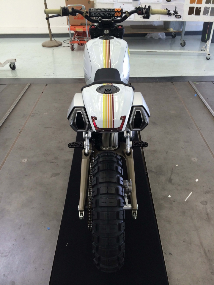 Дизайн переднего крыла мотоцикла с ложным воздухозаборником навевает мысли о «Гипермотарде» или «Мультистраде». Его рама была изменена до неузнаваемости, сверху установлен внушительный топливный бак и необычная выхлопная система Akrapovic, а сам байк укомплектован колёсами внедорожной размерности с резиной Pirelli Scorpion Rally, «злыми» подножками и мощными тормозными механизмами Brembo c эффектными плавающими дисками. Каких-либо дуг или других защитных элементов не предусмотрено, зато на мотоцикле красуется прочный кроссовый руль.