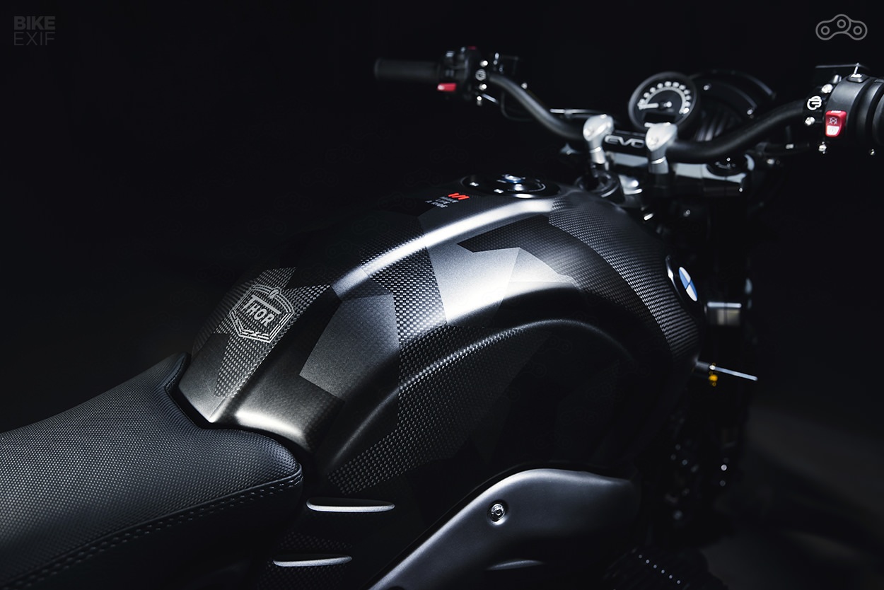 Также были изготовлены новая 7-дюймовая светодиодная фара, кастомные траверсы, титановый выхлоп SC-Project, а также хвост с сидением, установлен кроссовый руль Pro Taper, небольшой спидометр, а в финале британские мастера Image Design Custom покрасили байк в камуфляж и покрыли износостойким лаком.