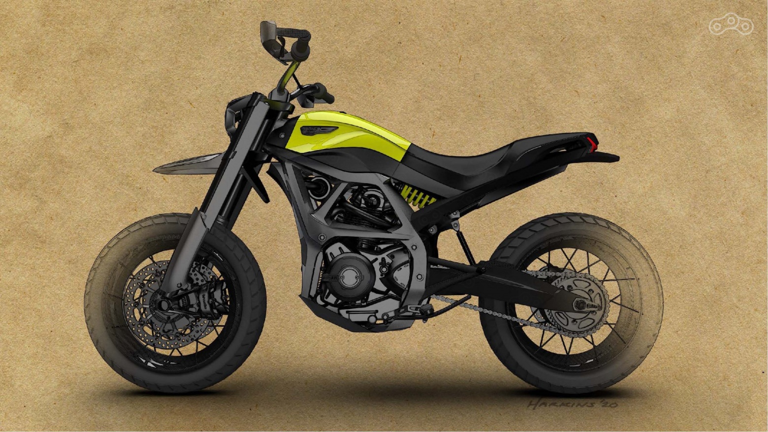 Харкинс решил отказаться от двух основополагающих столпов дизайна почти любого Ducati, решётчатой стальной рамы и L-образного мотора. У его скрэмблера дуплексная рама и одноцилиндровый двигатель. Однако другие характерные черты мотоцикла никуда не делись: Х-образный корпус фары, а также характерные формы бензобака и седла. Его скрэмблер получил одинарный высоко расположенный глушитель, который визуально сливается с хвостом мотоцикла при взгляде в профиль, а также двуплечий маятник и моноамортизатор, расположенный на продольной оси машины.