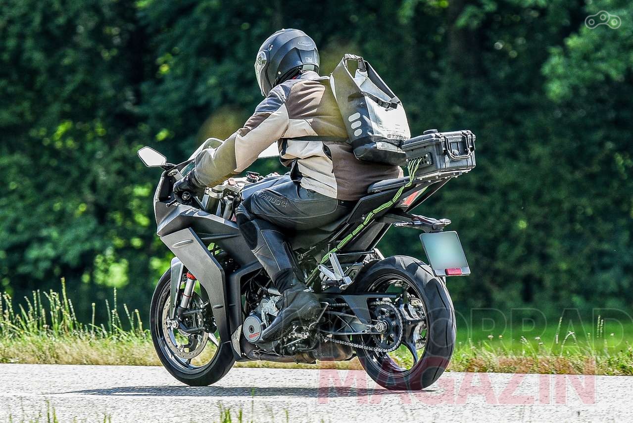 На фотографиях видно новое ветровое стекло иной формы, которое стало массивнее и закрывает теперь обе светодиодные фары мотоцикла с дневными ходовыми огнями. Боковой пластик стал более массивным и угловатым, он позволяет австрийскому спортбайку выглядеть немного солиднее своей скромной кубатуры, его дизайн немного напоминает теперь KTM RC8. Скорее всего новая облицовка обеспечит улучшенную ветрозащиту.
